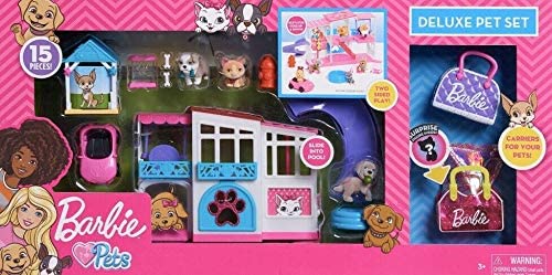 Now you can make your pocket-sized puppies right at home with the Barbie Pet Dreamhouse Playset! The Pet Dreamhouse Playset is beyond what any pet could dream of and includes lots of fun accessories. The house is perfect for two-sided play and features a slide, a swing, and a working elevator to get pets from the first to second floor. The set also includes one pet house, four pets, one pool, one fire hydrant, two bones, one food dispenser, one convertible car, plus two bonus pet carriers. Also, look for other Barbie Pet Playsets and link them together to create your own furry town! Ages 3+