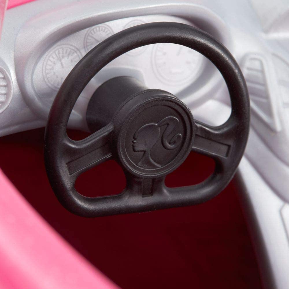 Barbie doll can hit the open road in her convertible! The sporty two-seater has wheels that roll to start a story with a simple push. A bright pink color, silvery rims and side view Mirrors, decaled headlights and black seats with seatbelts make for a stylish ride any driver would love. Barbie doll matches her car wearing a colorful floral dress with pink shoes. A trendy pair of sunglasses makes a traffic-stopping accessory for this girl on the go. Young minds can take off and explore all of the roads before them because you can be anything with Barbie! Includes Barbie doll wearing fashion and accessories, plus convertible. Doll cannot stand alone. Colors and decorations may vary.