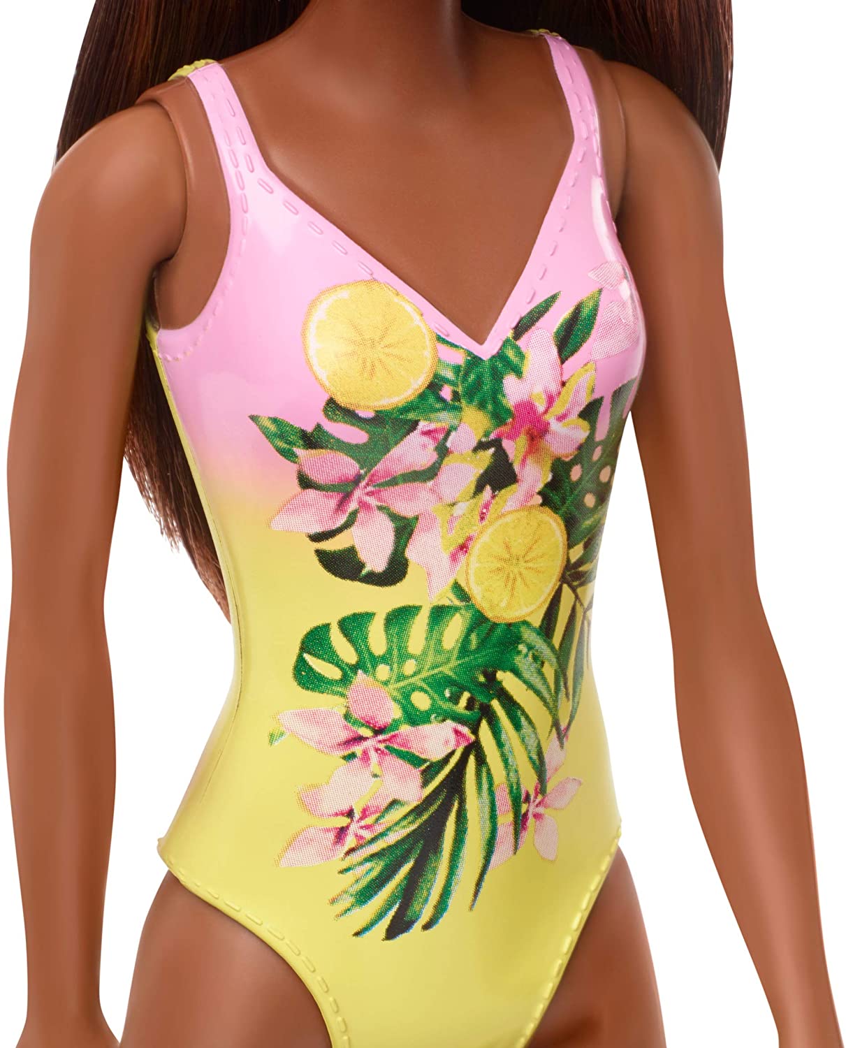 • Barbie doll has on a pink and yellow swimsuit with colorful floral design for a day by the water.