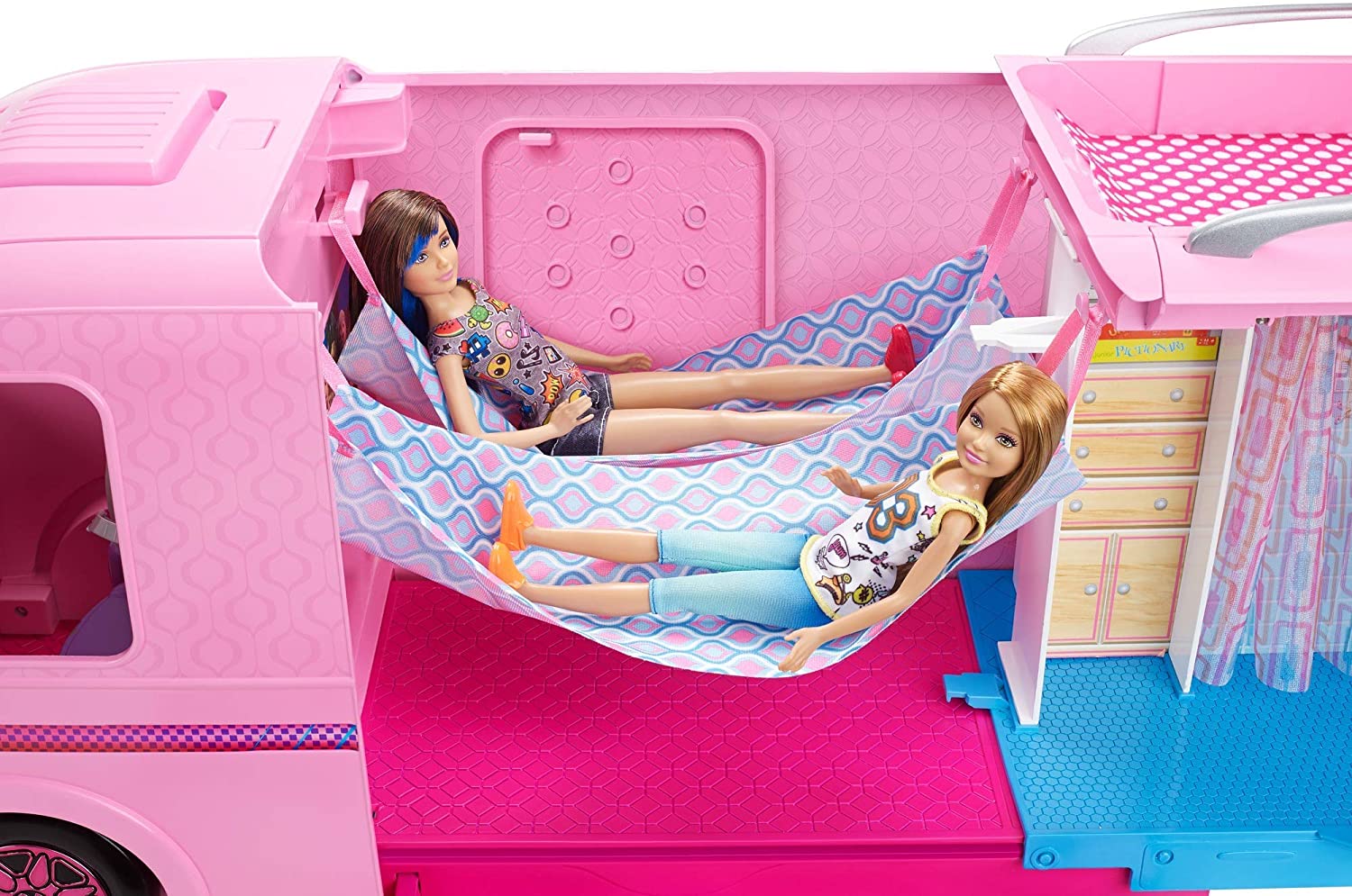 This amazing Barbie DreamCamper transforms from a camping RV into a campsite playset with room for four Barbie dolls to sleep (dolls sold separately). Designed in signature pink with rolling wheels, this camper opens to reveal so much more! Simply press the button at the top of the vehicle to activate a magical feature: the side panel opens, the top pops up and the front and back of the camper expand to create a play space more than 2 feet long! The open side becomes a pool with a water slide and stairs that fold out. The interior offers dining under the stars -set up the dining table and front vehicle seats that become two chairs. The back of the camper holds a closet and bathroom with sink, shower and toilet on one side -on the other side is a kitchen with sink, a refrigerator and a surprise fold-out table! DreamCamper also includes a fire pit and marshmallows roasting on sticks which allow for bonding moments. And two hammocks and two sleeping spaces mean four dolls can enjoy sweet dreams. When morning comes and it's time to move, close up the camper and roll to the next adventure. Cool details, like pink wheels, a moving steering wheel, silvery accents, a colorful stripe and open windows, make camping fun. Lots of accessories add to the storytelling play. Young adventurers will love hitting the open road with the Barbie DreamCamper and stopping wherever imagination leads because with Barbie, you can be anything! Includes camper play set with transformation features that include a pop-out pool (with ladder and stairs), pop-out rear (with bathroom and kitchen features), two hammocks and front seats that double as chairs; furnishings that include a dining table, two stools and a fire pit; and storytelling accessories, like four sticks with marshmallows, place settings, food, pillows and blankets for sleeping; dolls not included. Colors and decorations may vary.