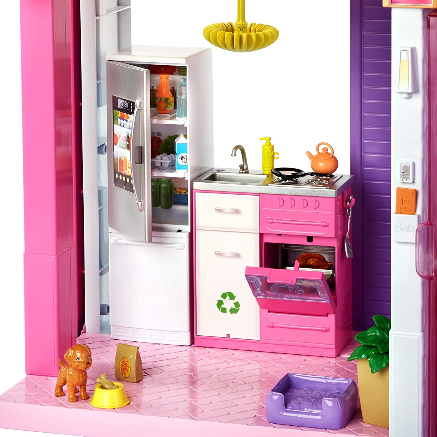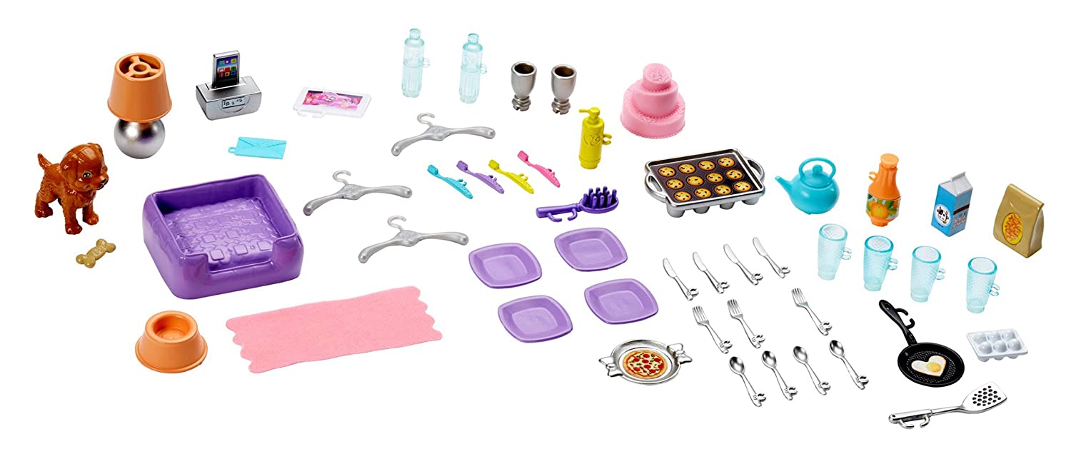 - Additional accessories -- the Barbie dollhouse comes with 70 pieces total -- encourage personal expression and inspire endless storytelling. Handles on some of the items allow role-play while plug-and-play design permits active play