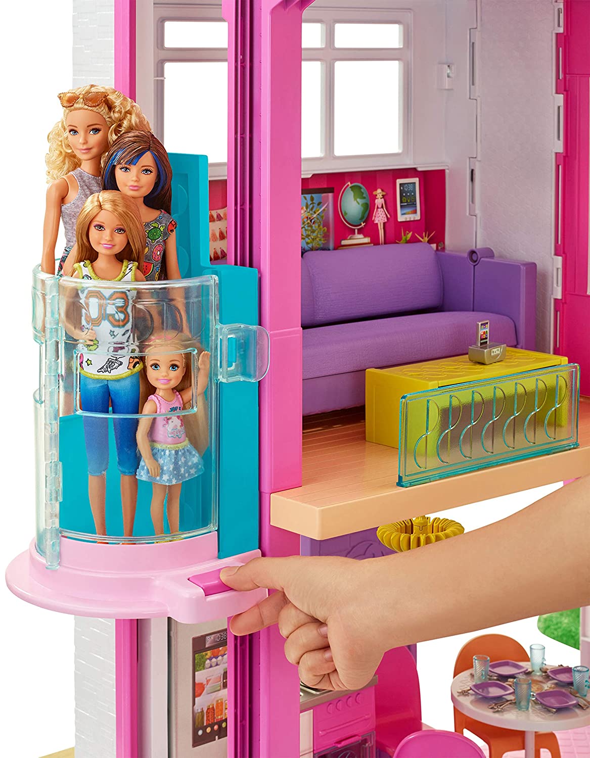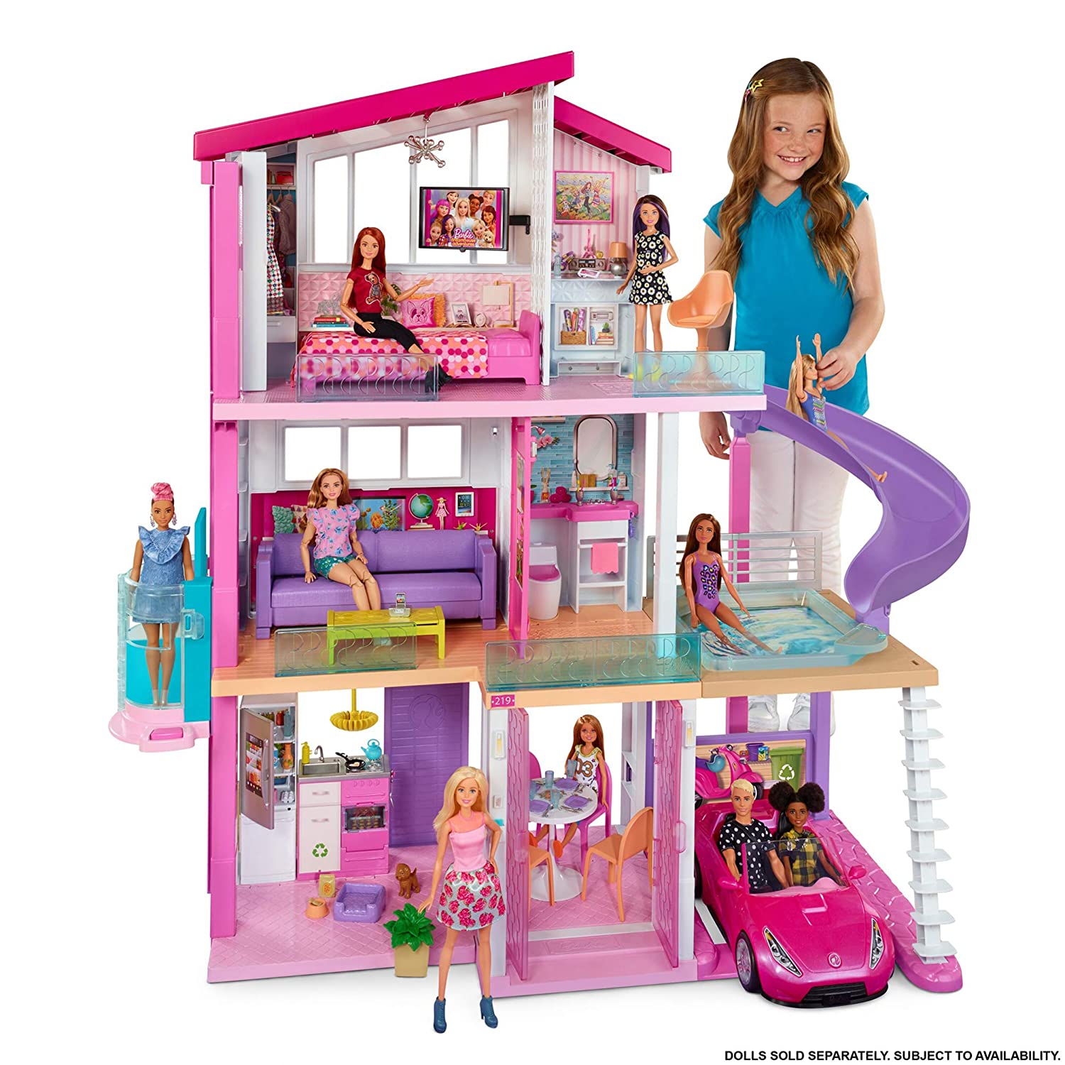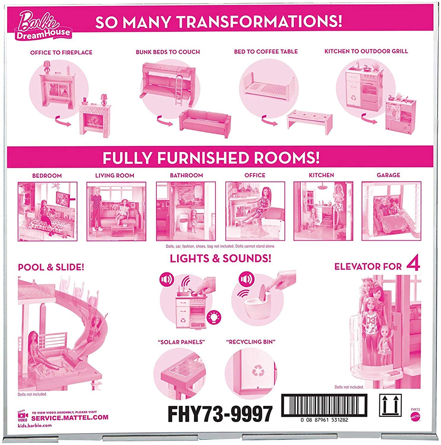 When young imaginations move into the Barbie DreamHouse, they turn this amazing dollhouse into a dream home! More than 3 feet tall and 4 feet wide, the Barbie DreamHouse has so many amazing features -- three stories, eight rooms that include a carport (car not included) and a home office, a working elevator that fits four dolls, a pool that has a slide descending from the story above, five pieces of transforming furniture, lights, sounds and more than 60 additional accessories, including an adorable puppy, that can all be used to decorate, set the scene and play out so many stories. Plug-and-play design helps keep pieces in place as small hands move around (and make clean up easy for adult hands!). Decorations and furniture for indoor and outdoor settings inspire play from all angles, and the transformations provide two-in-one fun while encouraging flexible action -- the couch turns into bunk beds, the coffee table flips for a bed sized for Chelsea doll (sold separately), the fireplace becomes a home office, the refrigerator turns into an outdoor food stand and the oven houses a barbecue in back. Lights and sounds add even more delightful touches -- the oven lights up and the timer ticks, the stovetop sizzles with the frying pan and whistles with the tea kettle and the toilet makes a flushing sound. Young decorators will have so much fun moving accessories around the house as they explore their personal style and tell all kinds of stories, from daytime to nighttime, indoor to outdoor, Barbie home alone or with a house full of friends and family (dolls sold separately). Pool parties, friend sleepovers, sister bonding, backyard BBQs, birthday, holidays and every day - - there are endless stories to tell and limitless ways to explore living in the Barbie DreamHouse because with Barbie, anything is possible. Includes Barbie DreamHouse and 70 accessories that include furniture, household items and a puppy; dolls, fashions and car not included. Colors and decorations may vary.