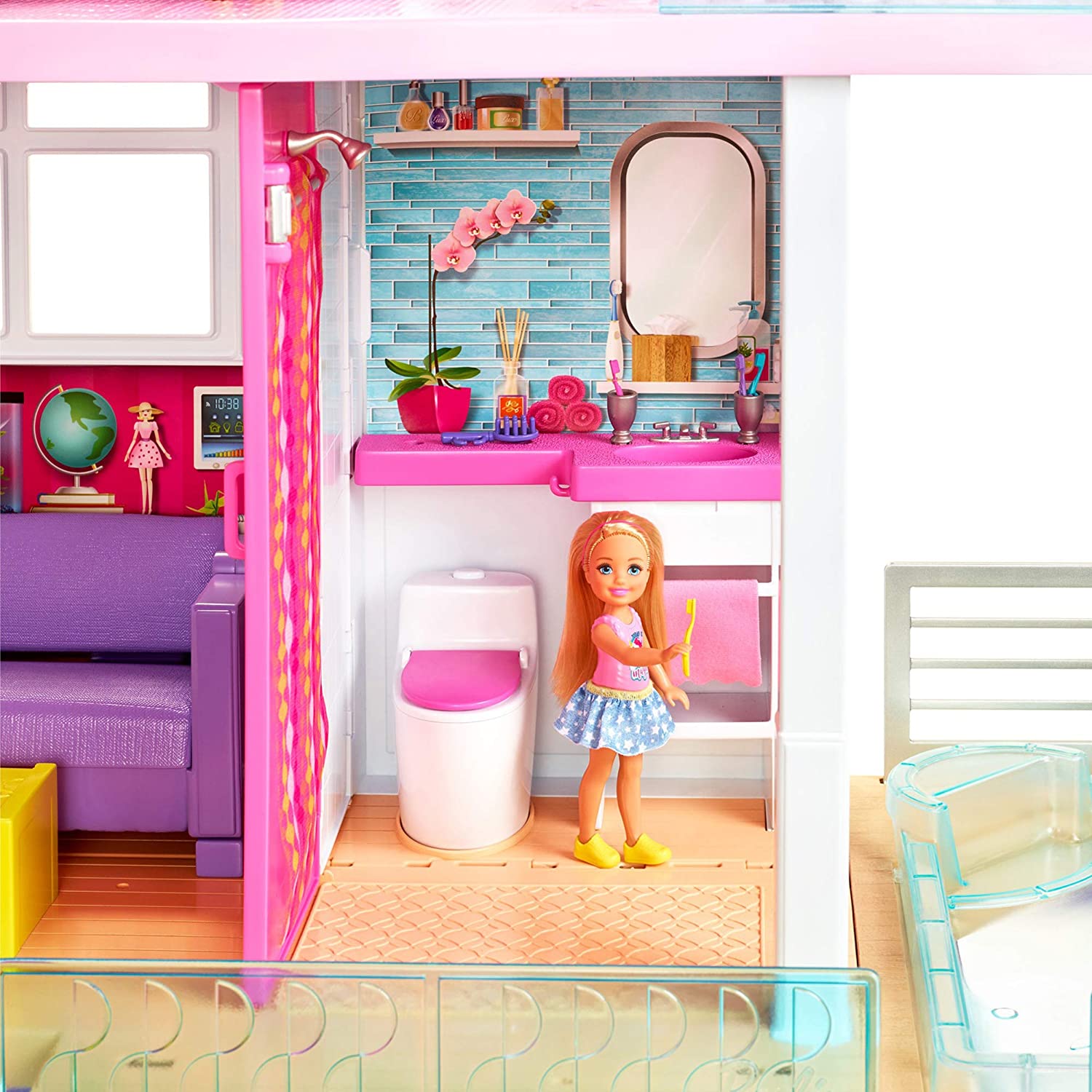 - Dreamy features include the working elevator with room for 4 dolls, a new home office, a carport and a second-story pool with a slide that starts on the third story -- fill it with water for a real splash