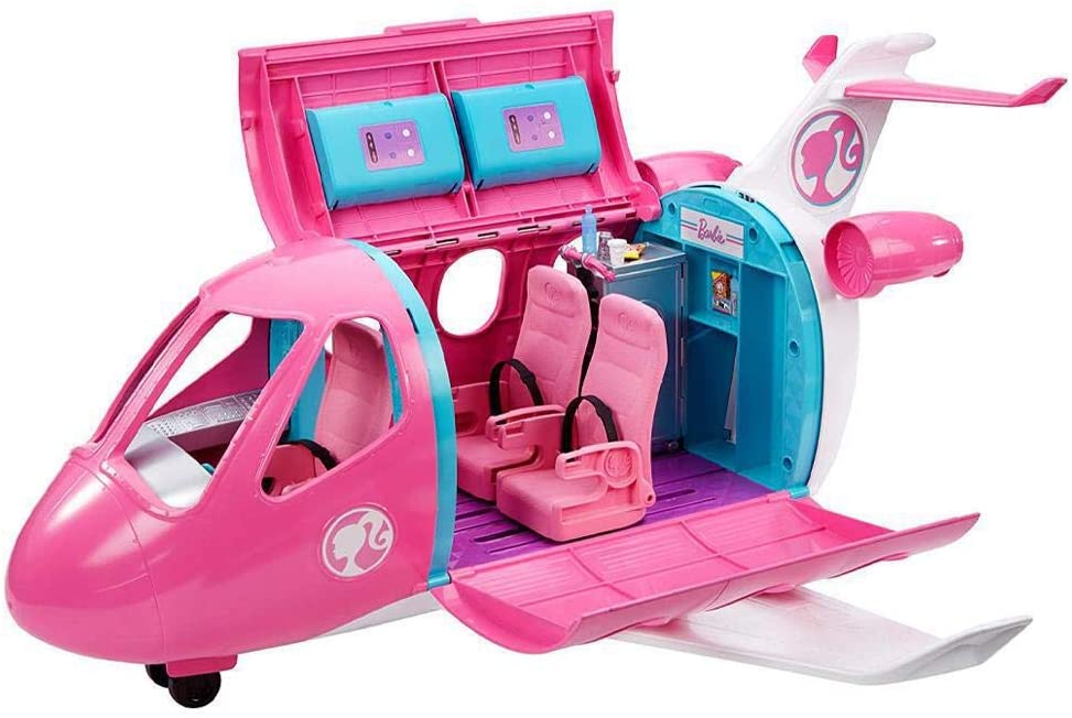 The Barbie Dreamplane is ready to help imaginations take off to anywhere! Kids can push it on its wheels to taxi on the ground or open up the top and side to reveal the inside and play out the ride. Realistic touches, like reclining seats, working overhead compartments and a snack cart with removable trays, are the ticket to role-play fun -a puppy is the perfect travel companion to share the adventure! Other accessories let kids play out eating, napping or resting while watching entertainment -flying has never been so easy! Inspired by Barbie Dreamhouse Adventures, fans can peek into the everyday life of Barbie as she embarks on exciting adventures with her family and friends or make up their own stories as they explore the world! Collect other Barbie travel dolls and toys to expand the play possibilities. Young travel lovers will enjoy visiting places near and far and playing out the plane ride, eating, sleeping and entertaining themselves, because when a girl plays with Barbie, she imagines everything she can become. Dolls not included. Colors and decorations may vary.