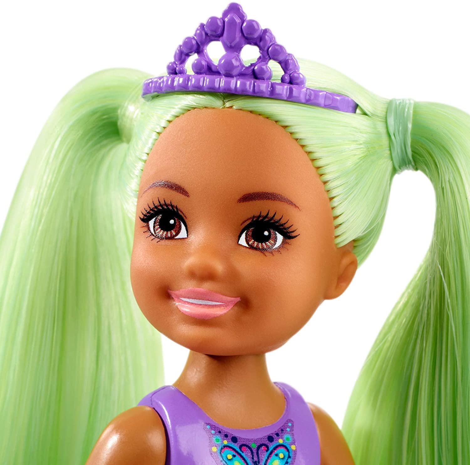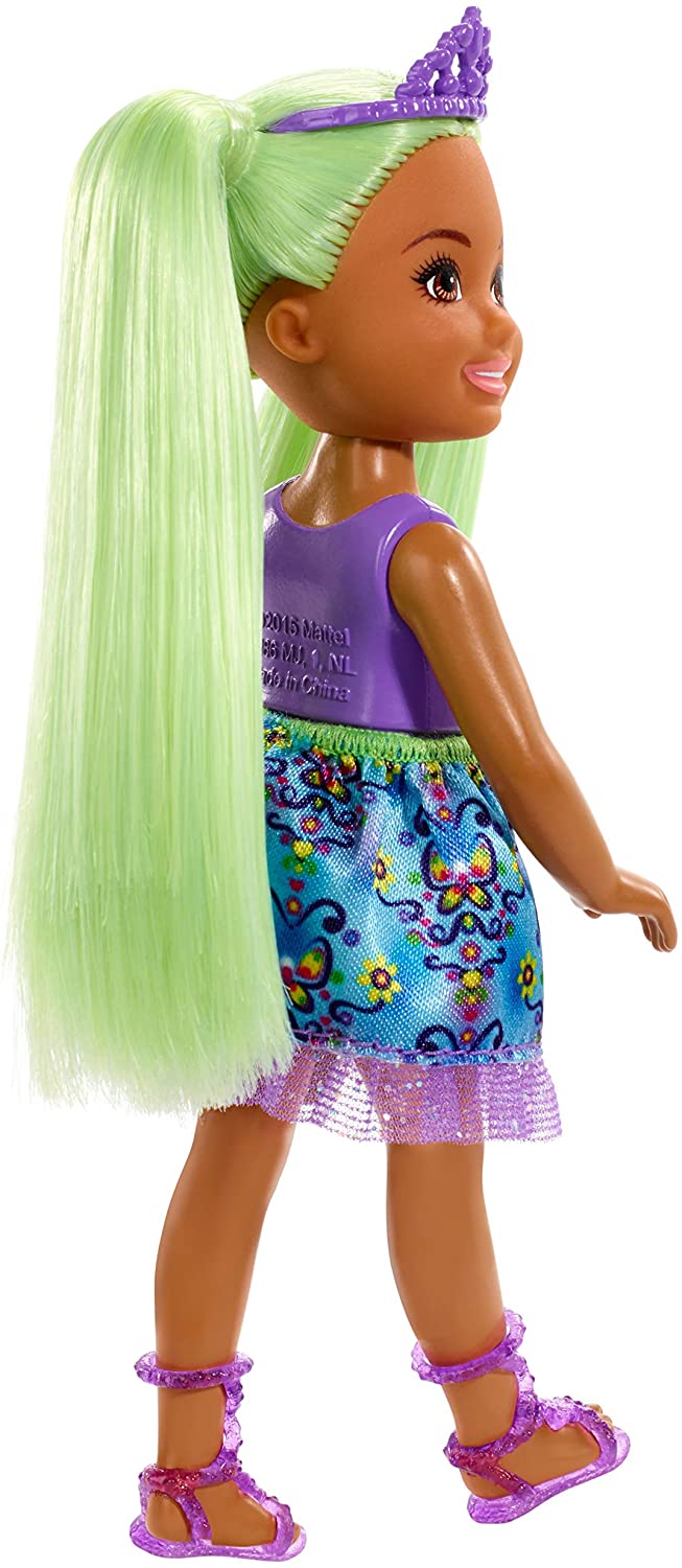 Chelsea Sprite dolls from Barbie Dreamtopia spark magical storytelling in neon brights! This Chelsea doll is ready for a fairytale adventure in a decorated bodice and a printed skirt with a sweet ruffle detail. She wears a purple headpiece in her bright green hair, and cute shoes add to the fantasy fun. It's easy to play out dreams real and imagined with Chelsea Sprite dolls because when you enter Dreamtopia, you wake up to a world where dreams become reality! Collect all the Barbie Dreamtopia dolls and toys and let your dreams set sail. Each sold separately, subject to availability. Doll cannot stand alone. Colors and decorations may vary.