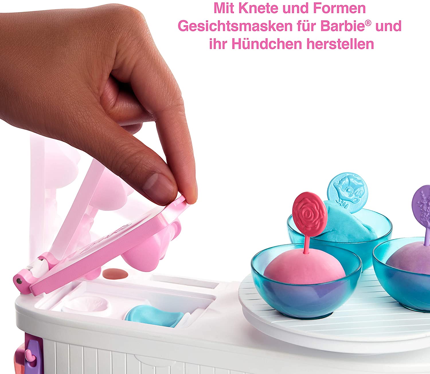 - The set includes Barbie doll wearing a robe and spa shoes, her puppy, a face mask station with 2 molds, 3 tubs of colored Barbie dough, a blemish marker and more than 10 accessories to help play out a rejuvenating facial routine.