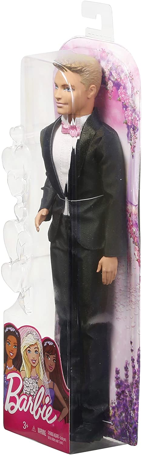 This handsome groom doll is ready to say “I do!” Play out all kinds of wedding stories with Ken doll ready to walk the aisle He’s dressed for the big day in a black tuxedo with a high collar on the white shirt and shimmery lapels on the jacket Black shoes are a classic finish and a pink bowtie adds a modern touch that matches the Bride doll (sold separately) Young imaginations can take this groom doll from proposal to happily ever after Includes Ken doll wearing fashions and accessories Doll cannot stand alone Colors and decorations may vary