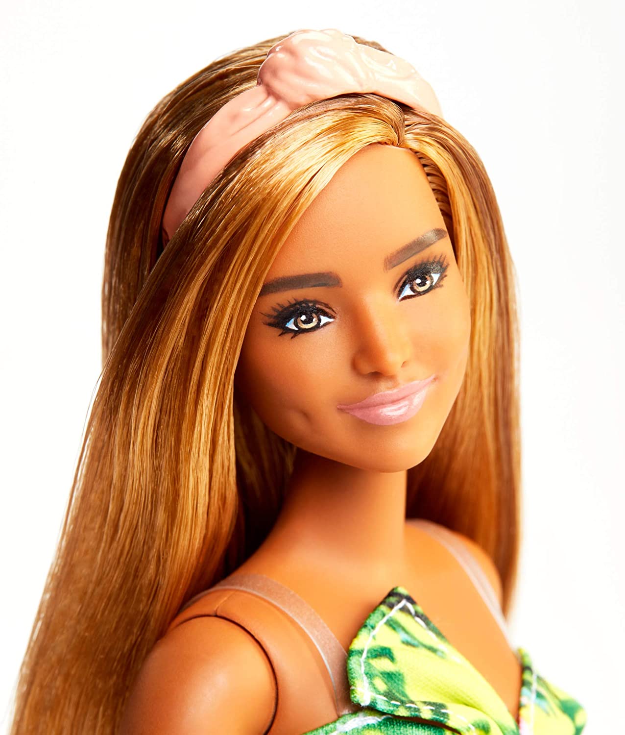 - Barbie doll has a curvier body than the original and wears a yellow dress with tropical print, tie and cut-out detail.