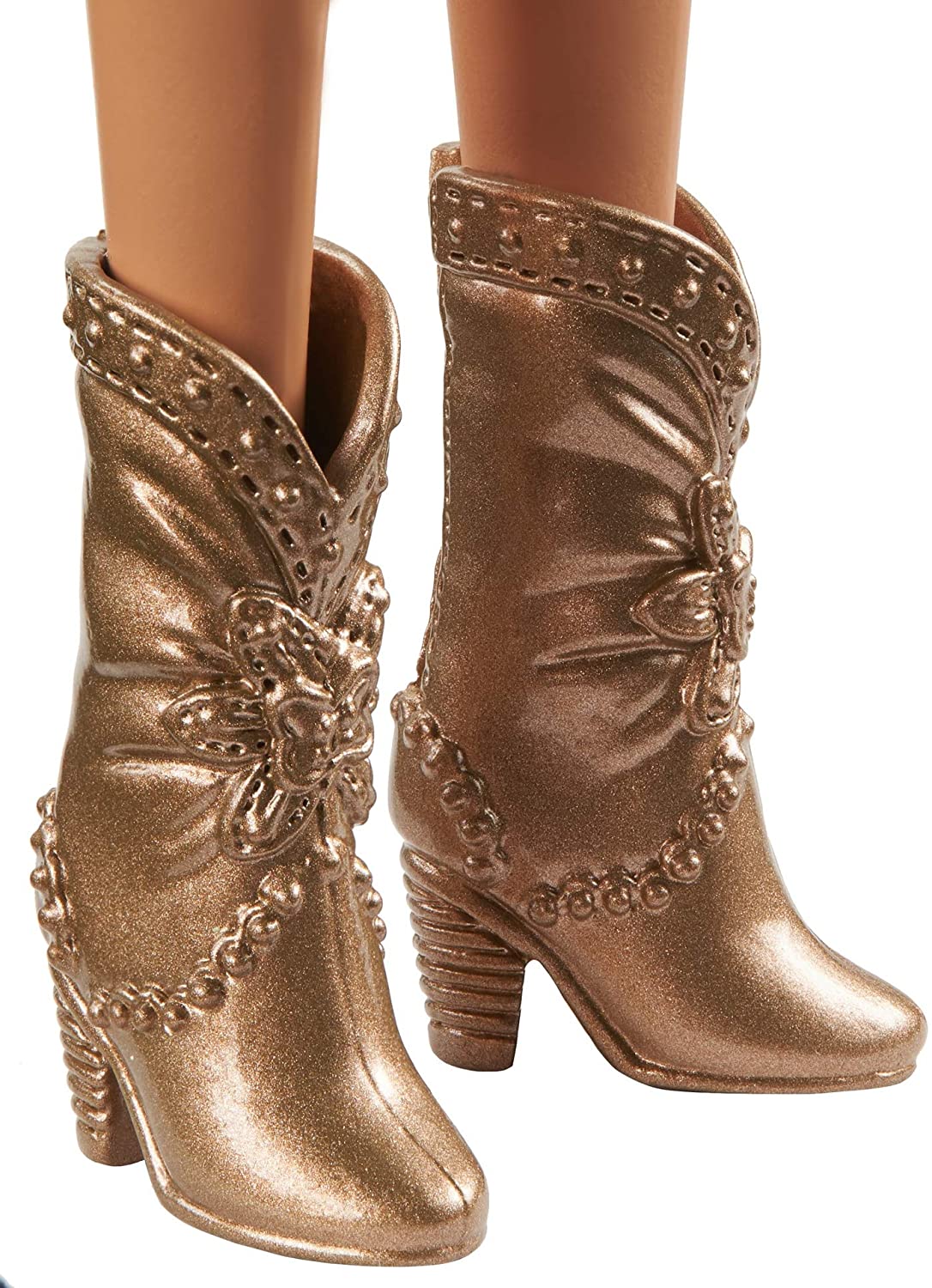 - Golden cowboy boots and golden drop earrings complete the outfit.