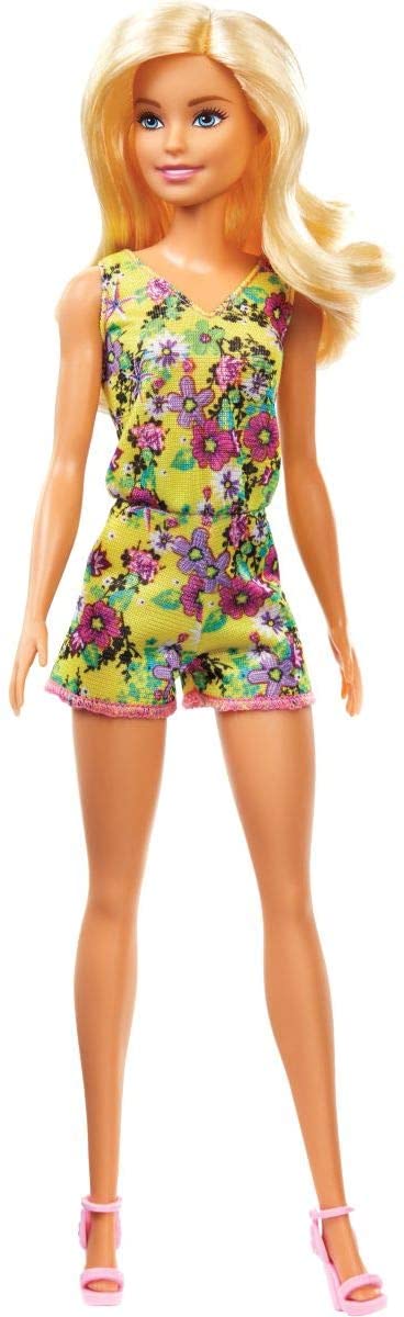 • ​Barbie doll wears a floral romper and has two additional dresses to switch up her outfit.