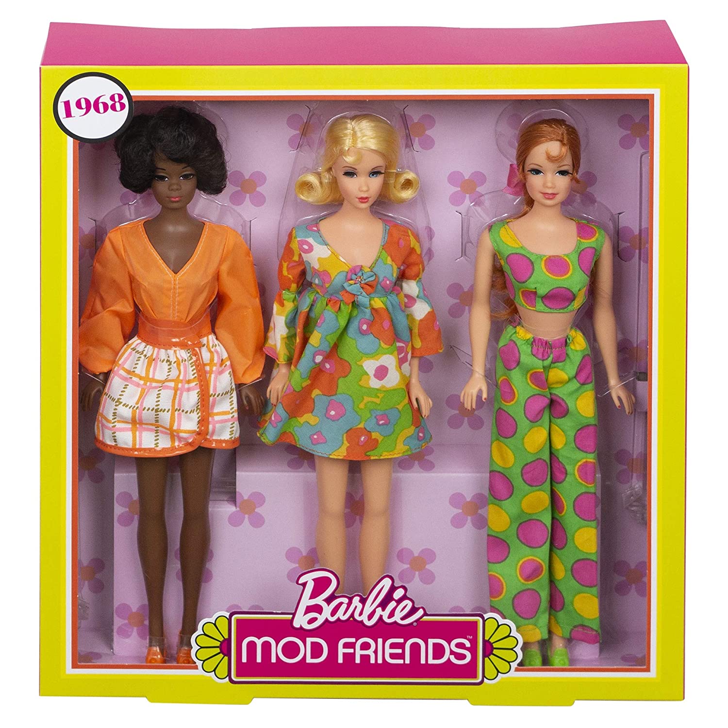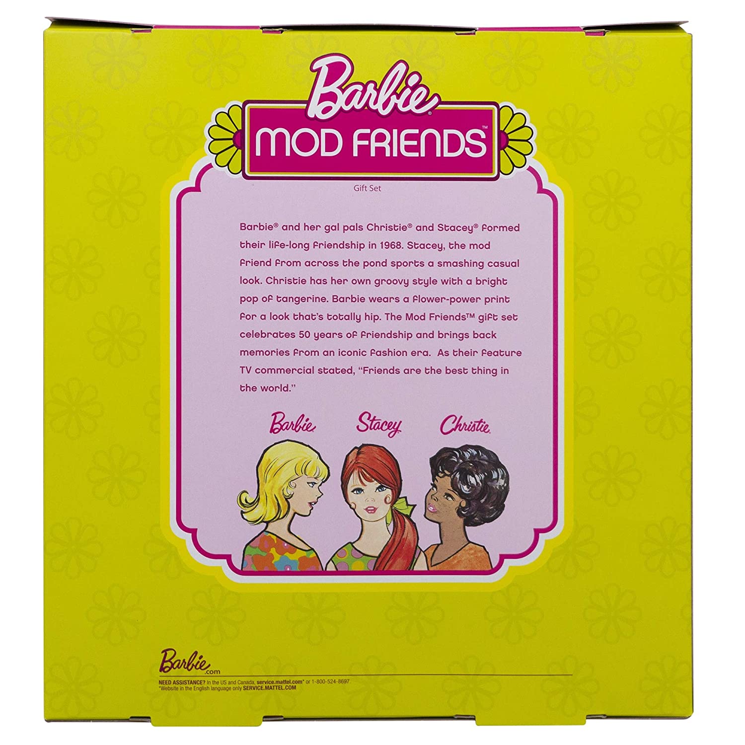 • Mod Friends, Barbie, Christie and Stacey dolls bring back memories from an iconic fashion era with this groovy reproduction gift set celebrating 50 years of friendship!