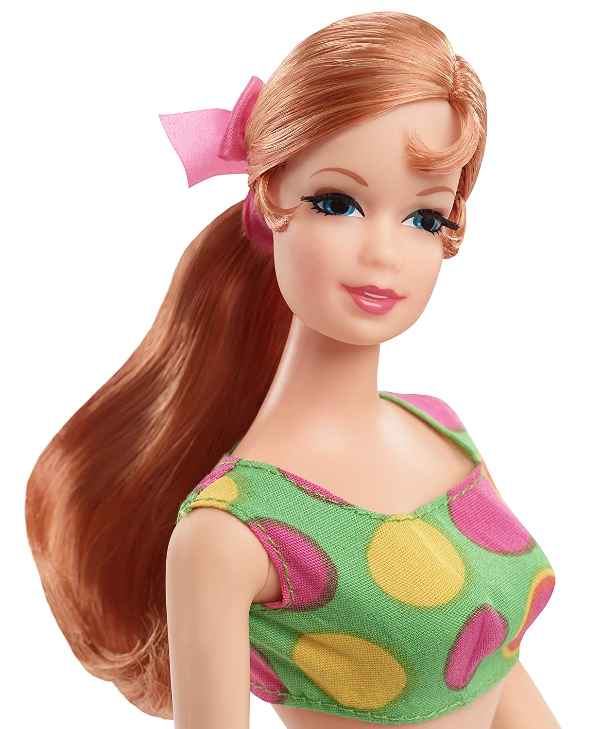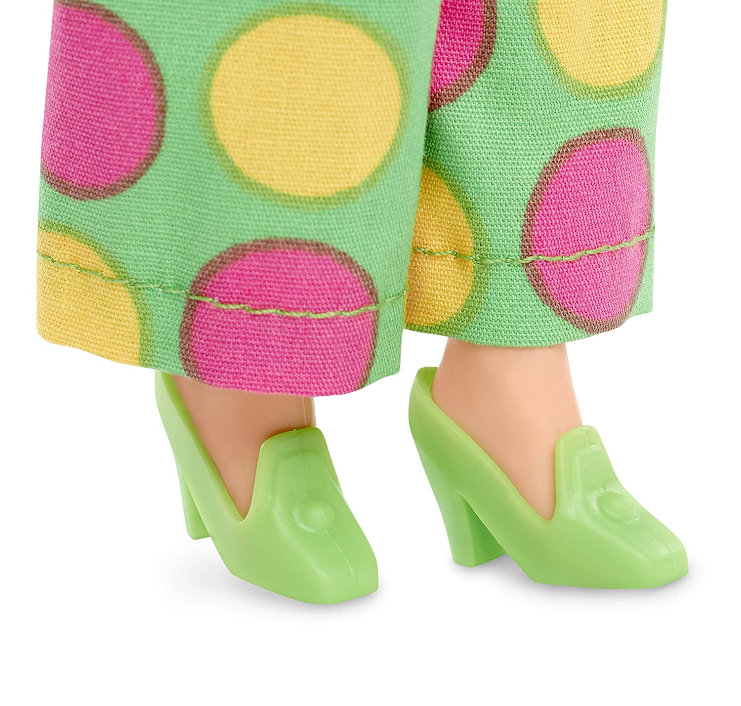 • The mod friend from across the pond, Stacey doll sports a colorful two-piece outfit with large pink and yellow dots against lime green