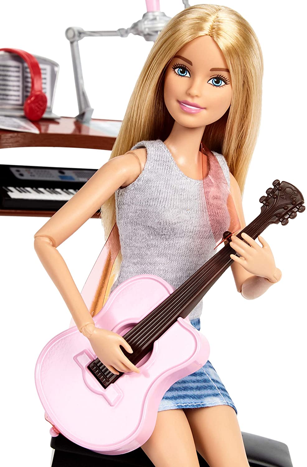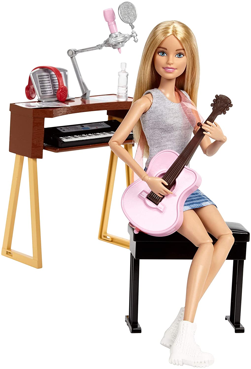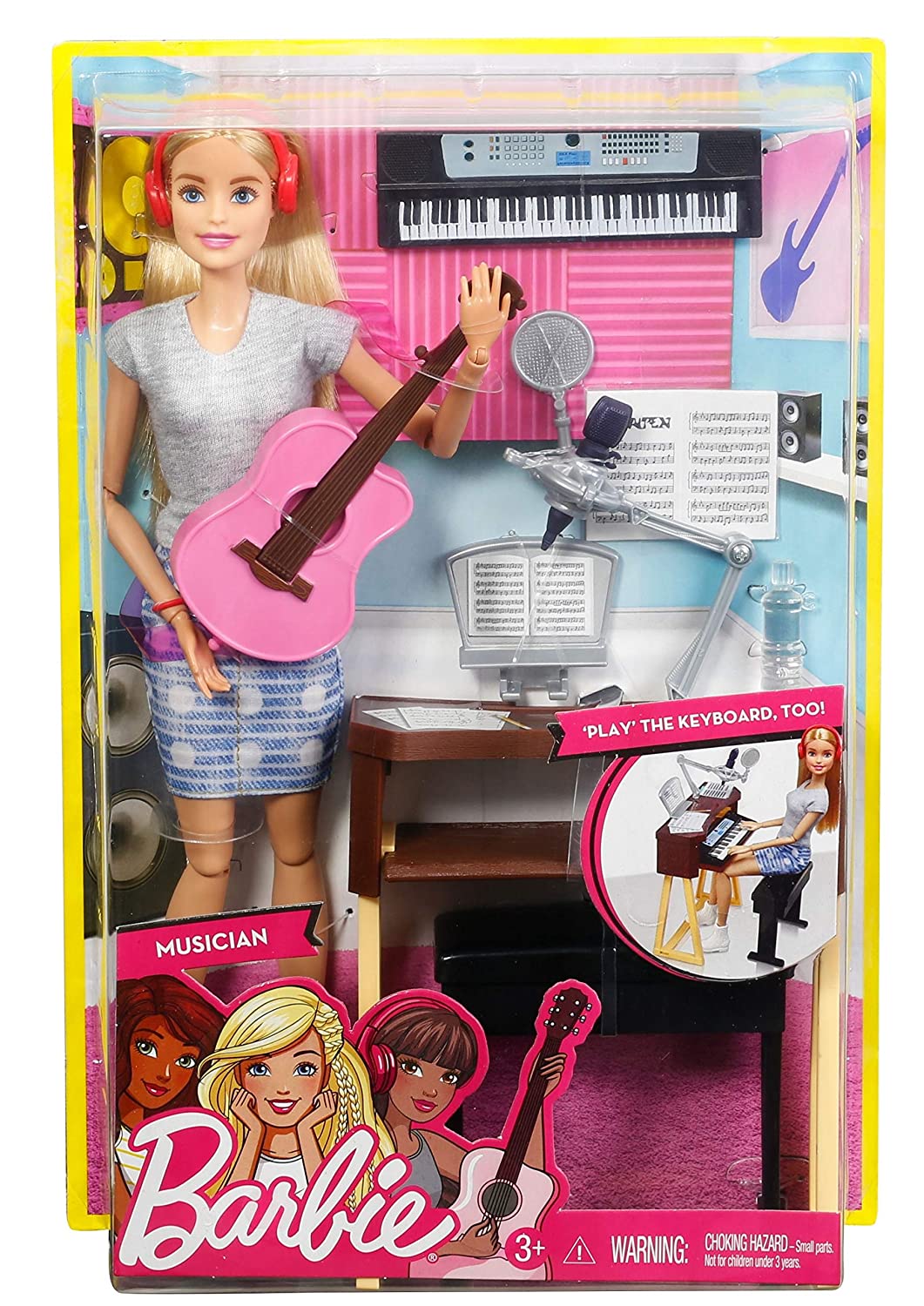 Barbie doll is ready to write, record and perform music with a play set that hits all the right notes. Barbie musician doll comes with two favorite instruments, a guitar and a keyboard, plus other accessories, to spark imaginations. She has fully articulated arms and legs in order to hold the guitar and sit on the keyboard bench! The pink guitar has a detachable strap for practice or performance. The wood-inspired keyboard stand features a pull-out shelf for the keyboard. Its top shelf has a stand for the music sheet and a stand that holds two microphones: a recording-style microphone and a microphone with a pop filter, which helps musicians filter noise. A cool black bench lets Barbie doll sit and provides a place to store the music sheet with a realistic removable lid. Barbie doll is ready to rise to the top of the charts wearing a gray top, a graphic blue skirt and white tennis shoes. Pink headphones, a water bottle and sheet music add additional storytelling play. Young musicians will love the many different ways to create, perform and dream with this music play set because with Barbie, you can be anything! Includes Barbie doll wearing fashion and accessories, guitar with strap, keyboard, keyboard stand and themed accessories. Doll cannot stand alone. Colors and decorations may vary.