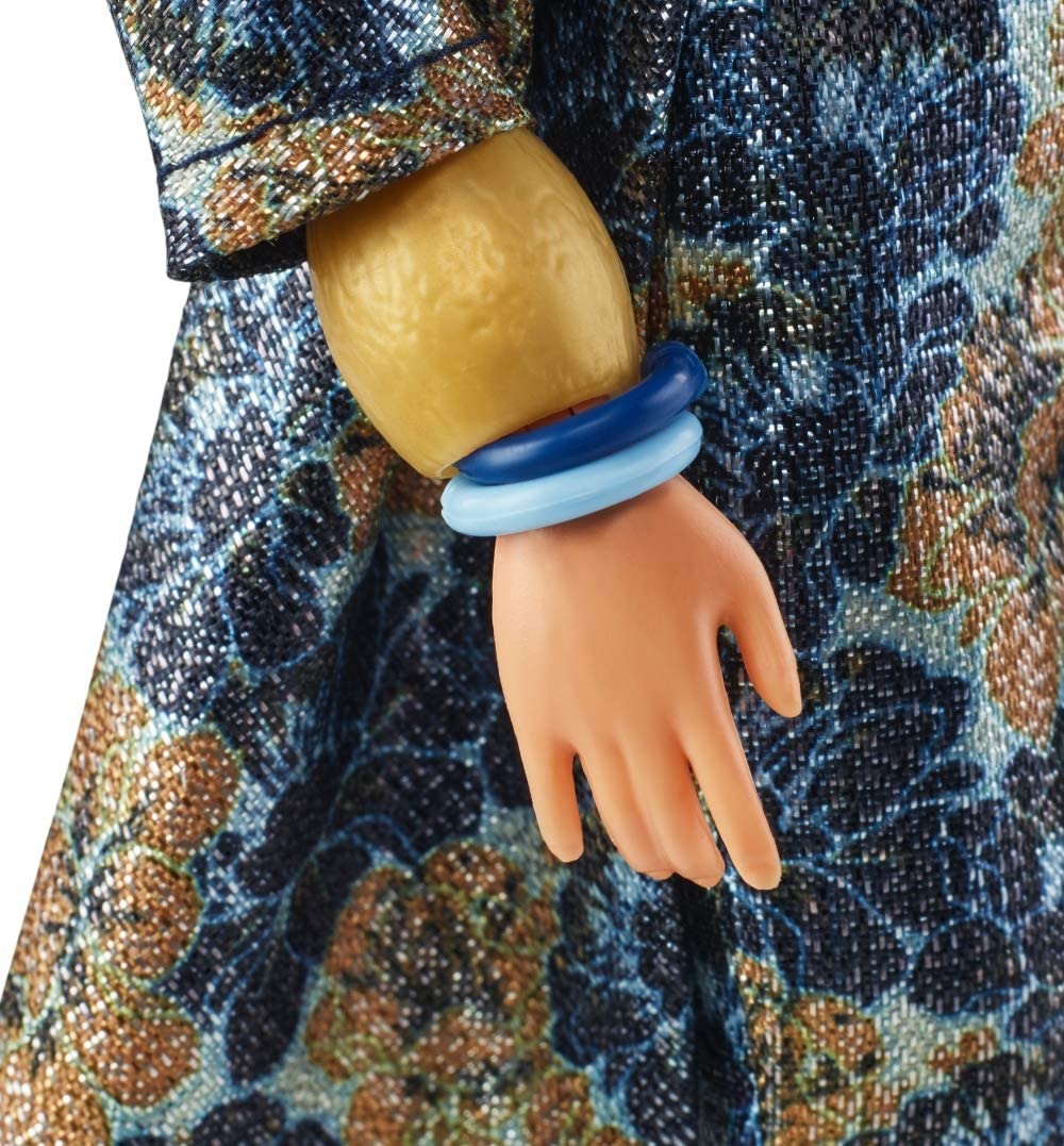 • The doll wears a floral-patterned brocade suit with striped blouse