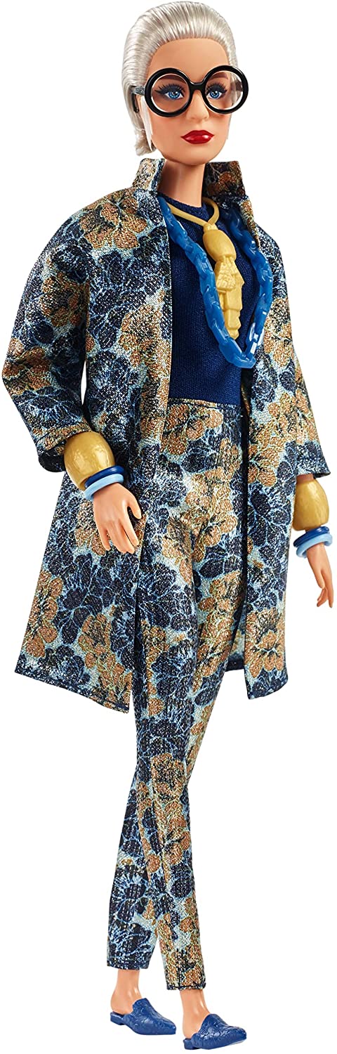 Iris Apfel is one of the most dynamic personalities in the worlds of fashion, textiles, and interior design. Self-defined as the "oldest living teenager," she infuses her sense of wonder, humor, and curiosity into her bold, highly colorful designs. A genuine fashion icon, with style in her DNA, Iris has been honored with awards, museum exhibits, and a documentary, among many other outstanding achievements. With a bright red lip, her signature oversized spectacles, and layers of accessories, she is the epitome of joie de vivre. The Barbie Styled by Iris Apfel doll models a look from the designer's Rara Avis collection. She wears oversized chic black glasses (of course), a floral-patterned brocade suit, striped blouse and layered necklaces and bracelets—all celebrating the vitality, wit, and unwavering fashion sense of a true original. Includes doll, doll stand and Certificate of Authenticity. Colors and decorations may vary.