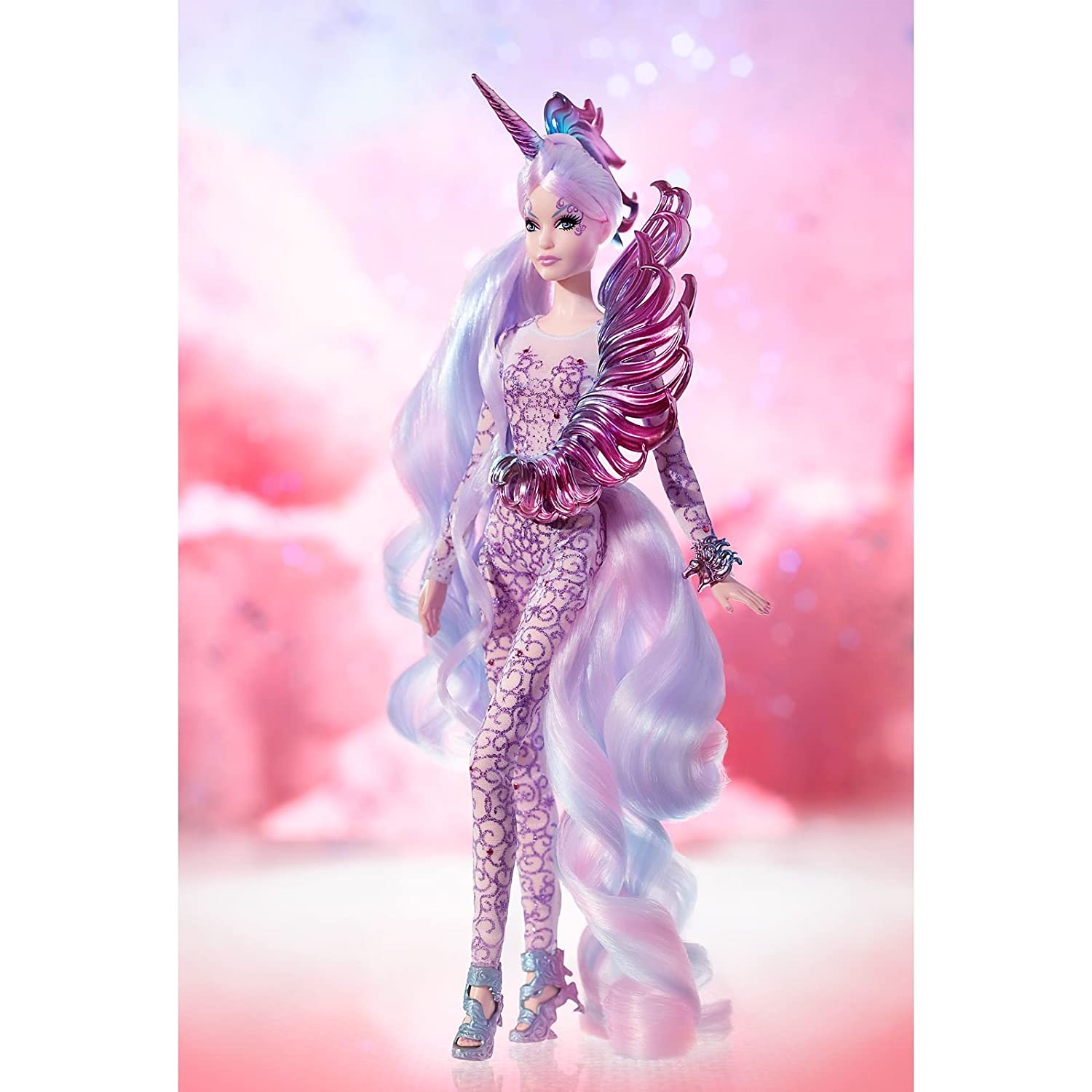 - The alluring Unicorn Goddess Barbie doll wears an iridescent unitard with intricate shimmering swirl design