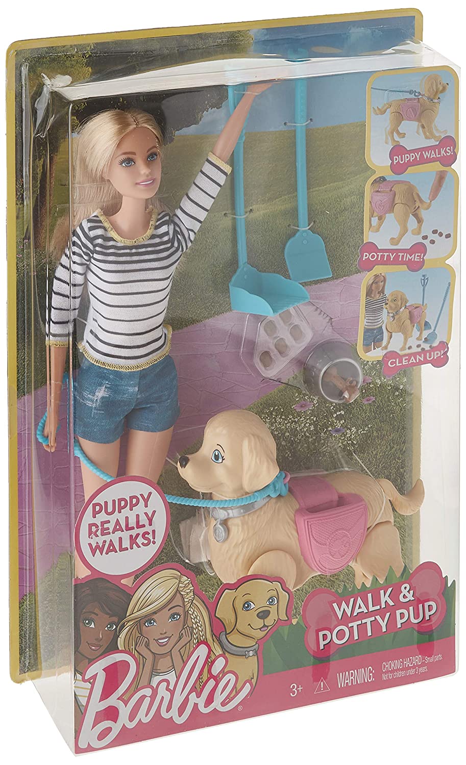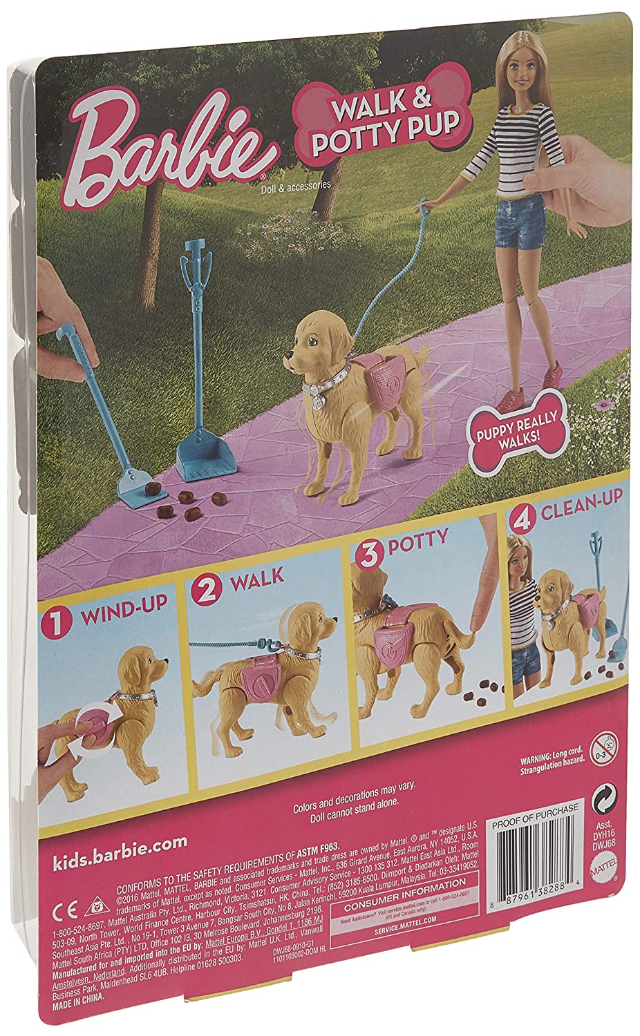 This special puppy has walked its way into Barbie doll’s heart! It’s so fun to help Barbie doll take her dog for a walk and potty train: simply wind the knob on the puppy’s side and pull back on the leash -- the puppy starts walking all on her own! Help Barbie doll keep up -- the leash fits on her hand for added realism. When it’s time for a potty break, push on the puppy’s tail. Barbie doll can clean up using the broom and scooper. A feeding bowl and bone that fits in the puppy’s mouth make the perfect reward for being such a good dog! Barbie doll’s casually cool outfit pairing a striped top with denim shorts and pink shoes is perfect for a day at the dog park. Animal lovers will have so much fun taking this adorable puppy for a walk and playing out friendship and nurturing stories between two best friends. Includes Barbie doll wearing fashions and accessories, puppy (with leash) that walks and goes potty, broom and scooper, plastic dog “poops,” feeding bowl and dog treat. Doll cannot stand or walk alone. Colors and decorations may vary.