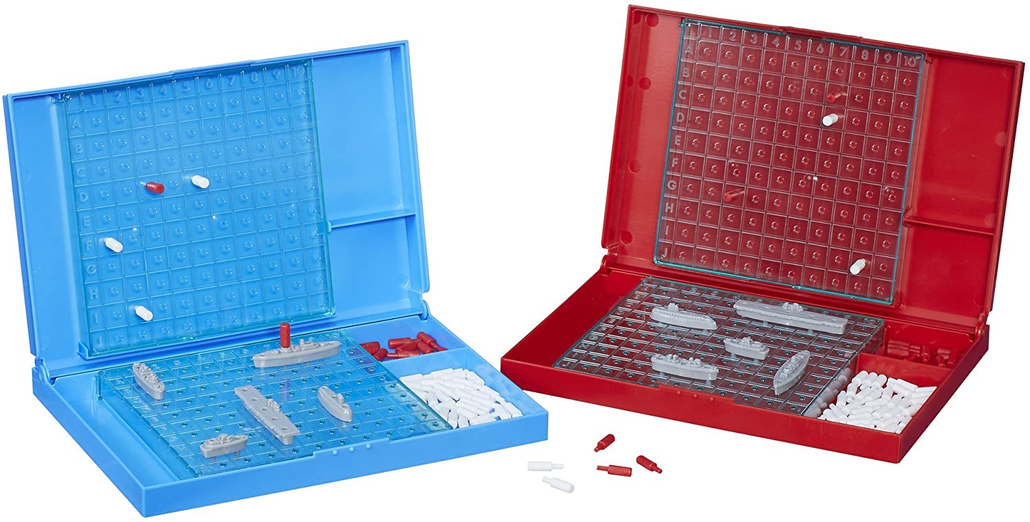 - Includes 2 self-contained game kits (each has an ocean grid, barrier lid, and storage compartments), 2 fleets of ships (each has a Carrier, a Battleship, a Cruiser, a Submarine, and a Destroyer), and 2 sets of marker pegs (white and red)