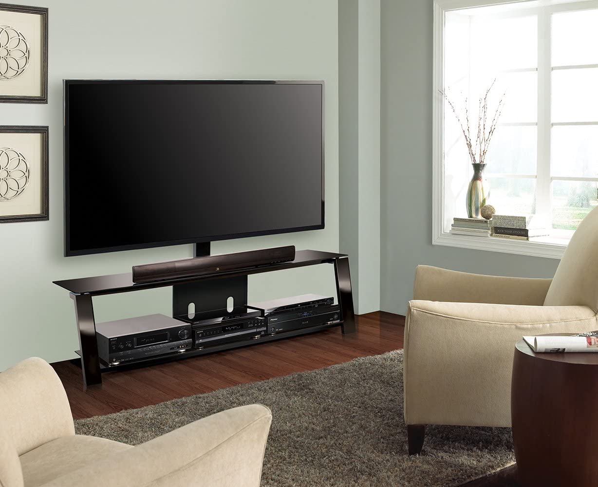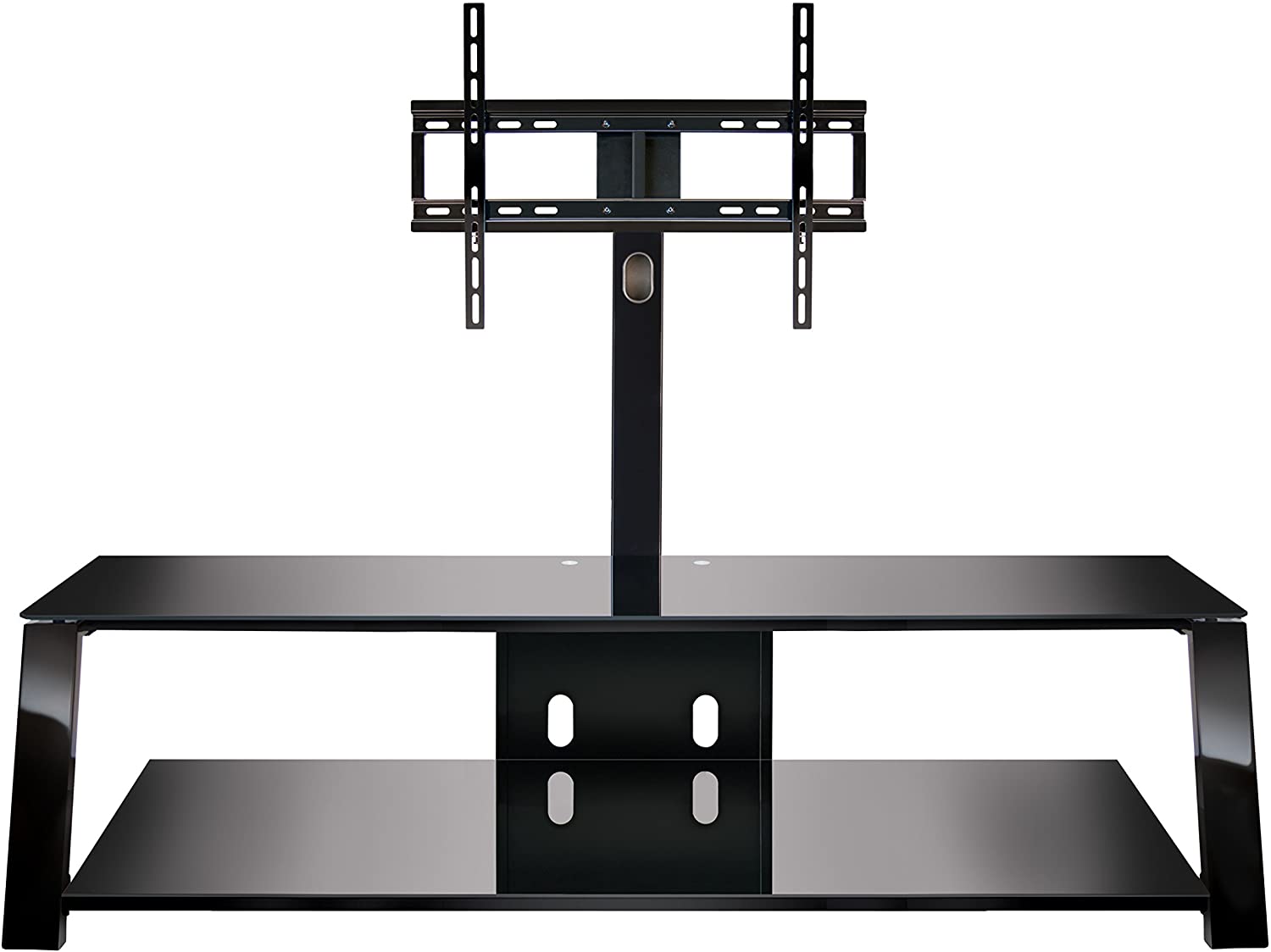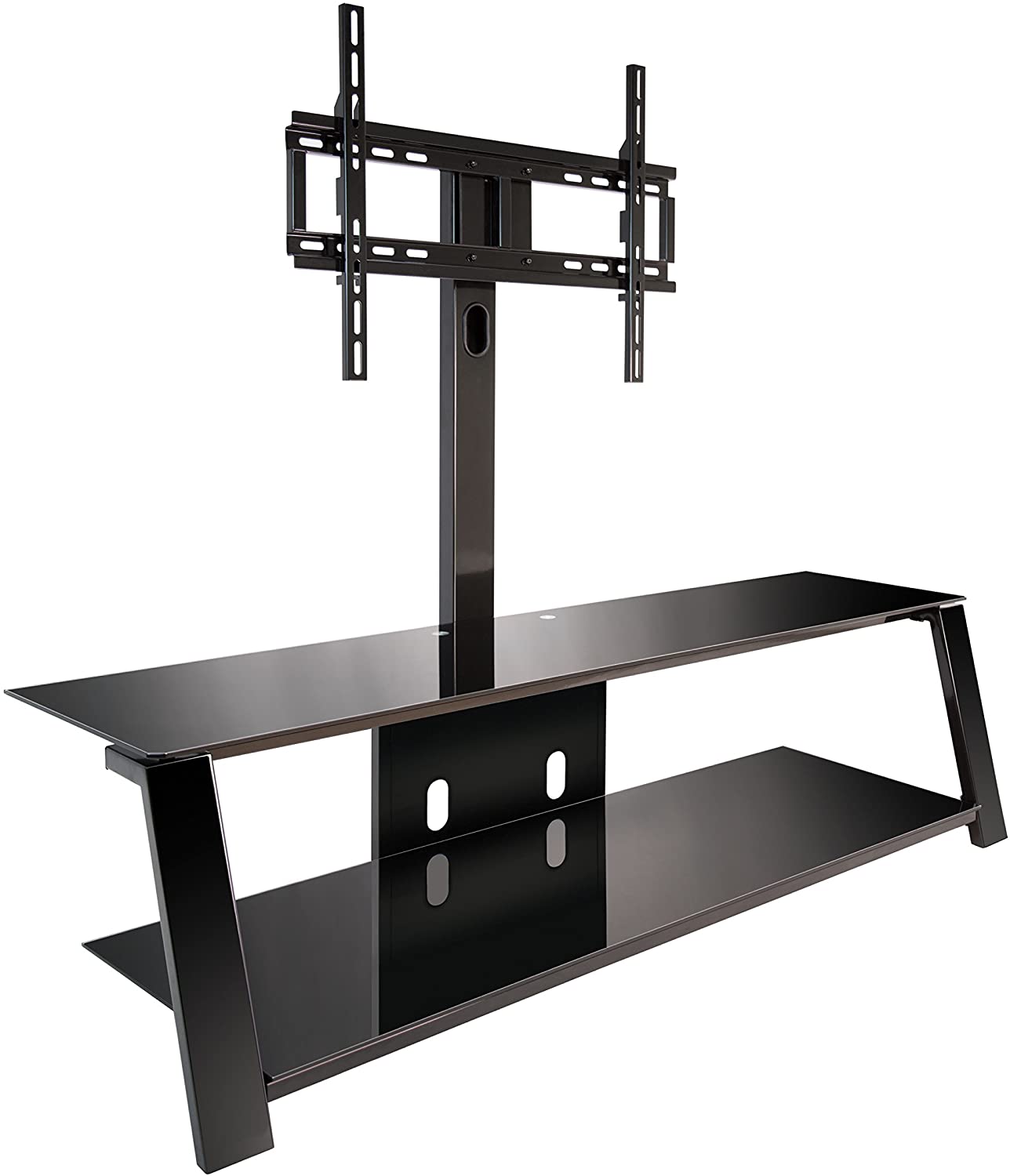 Triple Play Universal Audio/Video System with Swivel TV Mounting. Bell'O TP4463 accommodates TV's up to 70” or 125lbs. Stand can hold up to 6Audio/Video components and gives you 3 different options on how it can be set-up. Stand alone with TV on top, Stand with Swivel pole mounted TV, or Stand with wall mounted TV. Everything is included to accommodate your personal needs. Swivel mount moves Right & left for optimal viewing. Elegant Black tempered safety glass and a black powder coated, scratch resistant steel frame. Open architecture design allows for component ventilation and the built in CMS Cable Management System allows you to hide and organize your wires and interconnect cables.