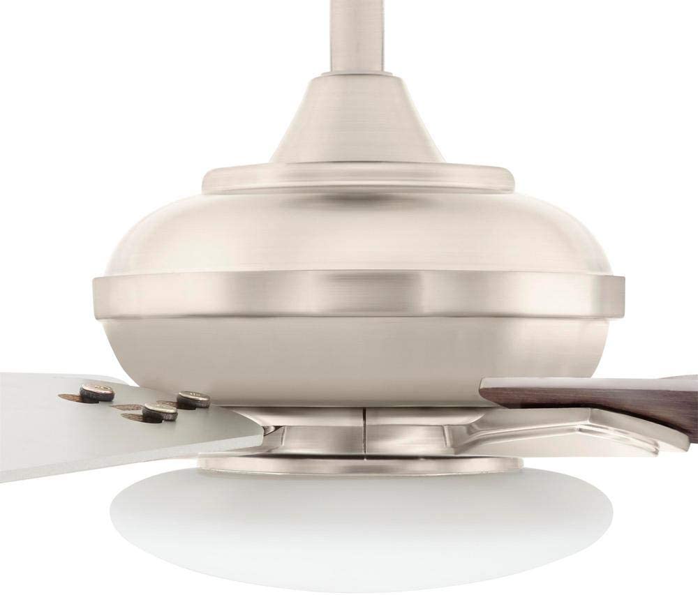 - Transitional ceiling fan perfect for small indoor spaces 5 reversible silver and seasoned wood blades Includes Integrated LED light kit remote control and down rod