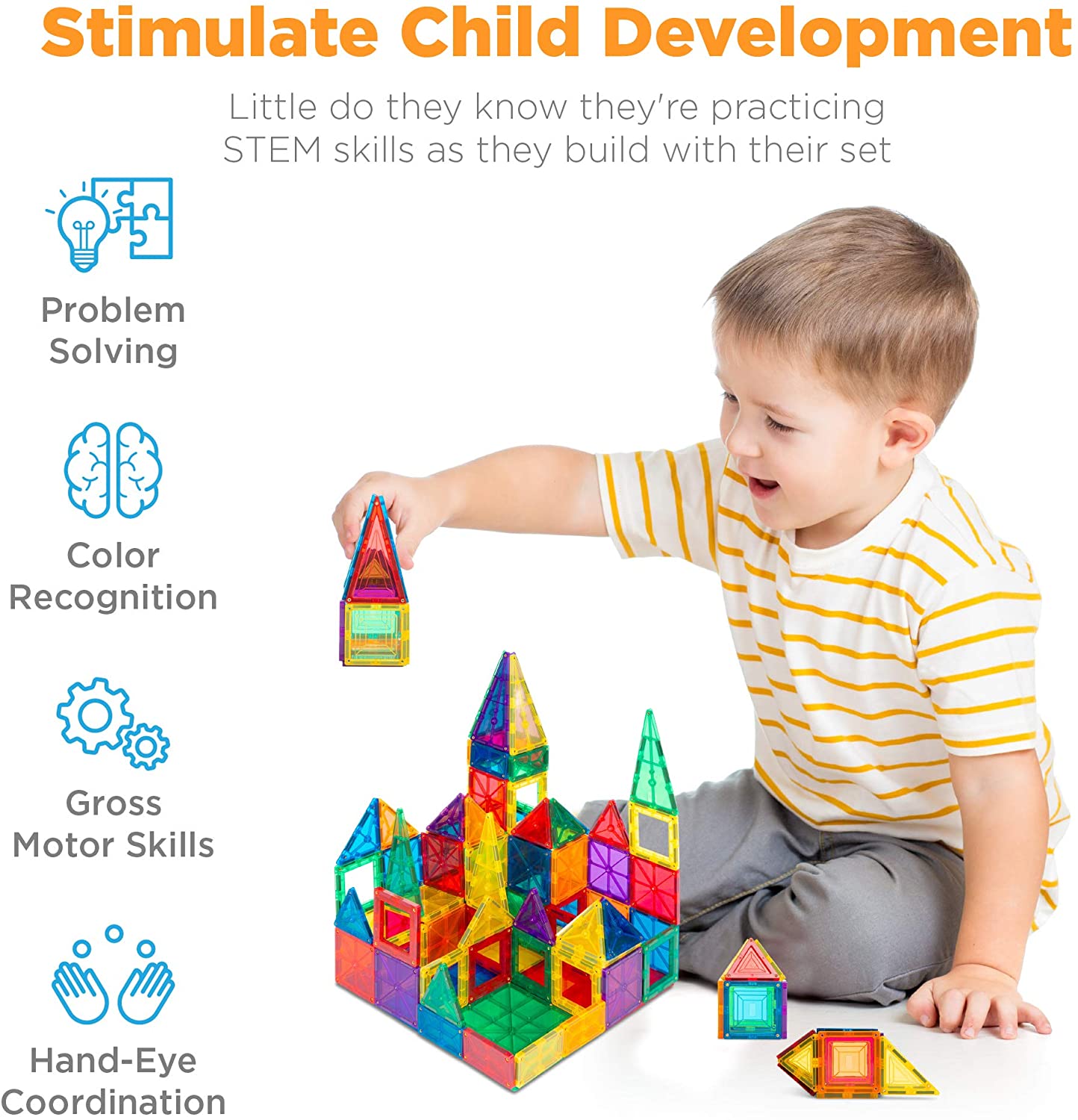 Give your little one a fun toy that lets them enjoy learning! This 100-piece set of magnetic building tiles is perfect for developing children's creativity! Ideal for building tall towers and countless other cool structures, it stimulates imagination, develops problem-solving and motor skills, and helps with learning shape recognition. With these magnetic pieces, entertainment and education are one and the same!