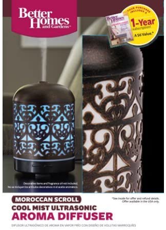 Important Made in USA Origin Disclaimer: For certain items sold by on the displayed country of origin information may not be accurate or consistent with manufacturer information. For updated, accurate country of origin data, it is recommended that you rely on product packaging or manufacturer information. The Better Homes and Gardens Essential Candle Oil Diffuser is aromatherapy for the home. Its ultrasonic vibration releases a cool mist and automatically shuts off when dry to humidify the air and enhance the environment. This Moroccan scroll decor candle diffuser features an exotic design to complement the surrounding space.