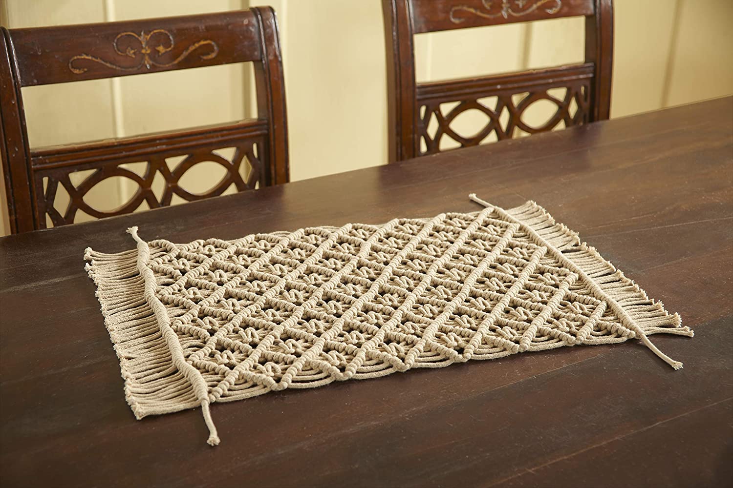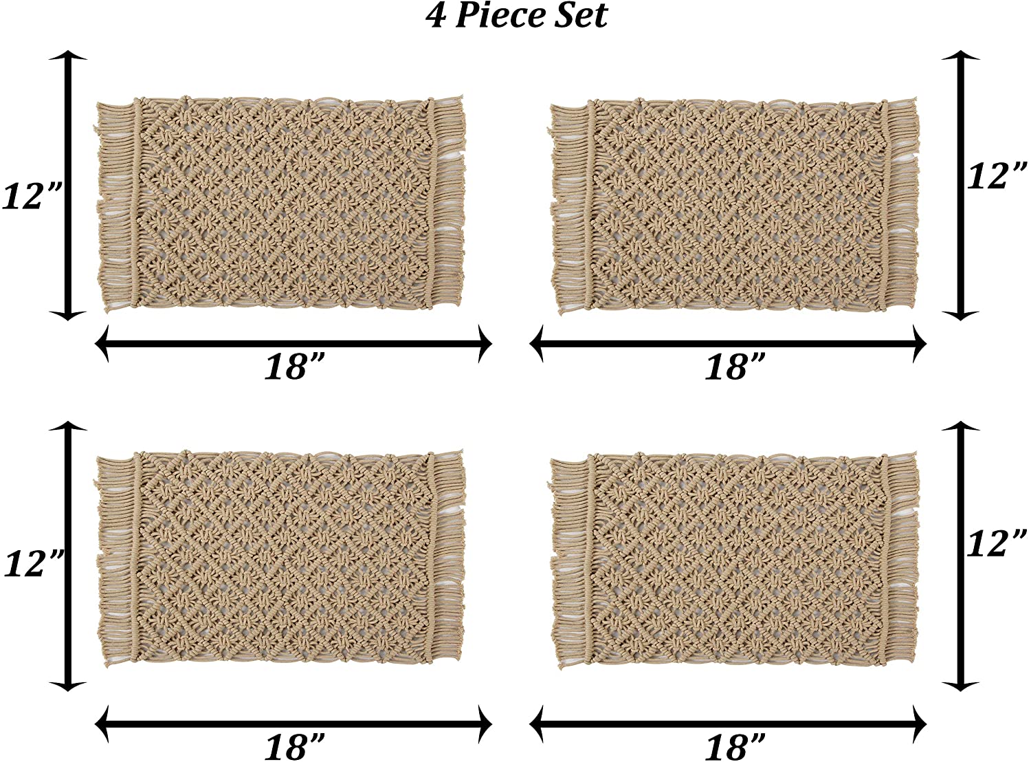 The Macrame collection of 12" x 18" Set of 4 Placemats is handwoven with cotton twine to weave macrame elegantly, flawlessly, simply, tidy, luxury, for you, these table mats are the best chioce. A versatile home style that the placemat gives the home a warmer sense of belonging. A simple and generous design gives you a stylish dining environment. Add a rustic look and timeless art to liven up any table. The stunning handcrafted Set of 4 Placemats is a must-have for all seasons. Awaken your inner bohemian and style up your tables with a beautiful decorative piece for your tablescape. The cotton macramé ropes are handmade with an eye to detail inspired by the traditional art of macramé knitting giving the table Placemats a thicker, fuller, and stylish look. It is made of 100% Cotton for easy care and can be used for an extended period of time. This Macrame Collection includes a 12" x 18" Set of 4 Placemats and is available in 4 colors in solid and 3 in the two-tone stripe. we also offer matching 13X36" Runner and 15" Square Set Of 4 Placemats sold separately.