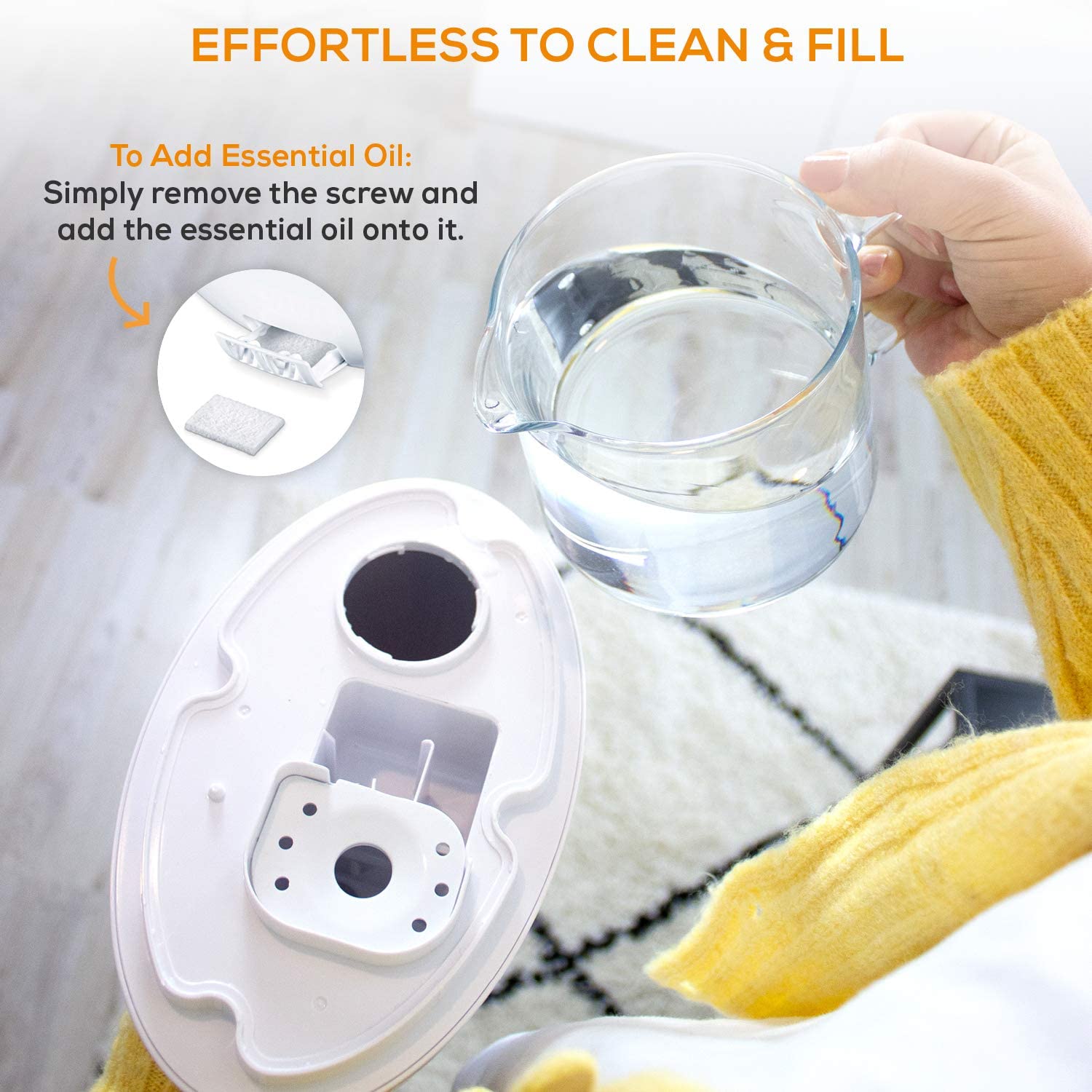 - ADJUSTABLE MIST LEVEL: Just fill the removeable water tank with water and choose from 3 Mist Levels (6.8 fl. oz./h | 5.0 fl. oz./h | Night Mode - 5.0 fl. oz./h) and the system will start.
