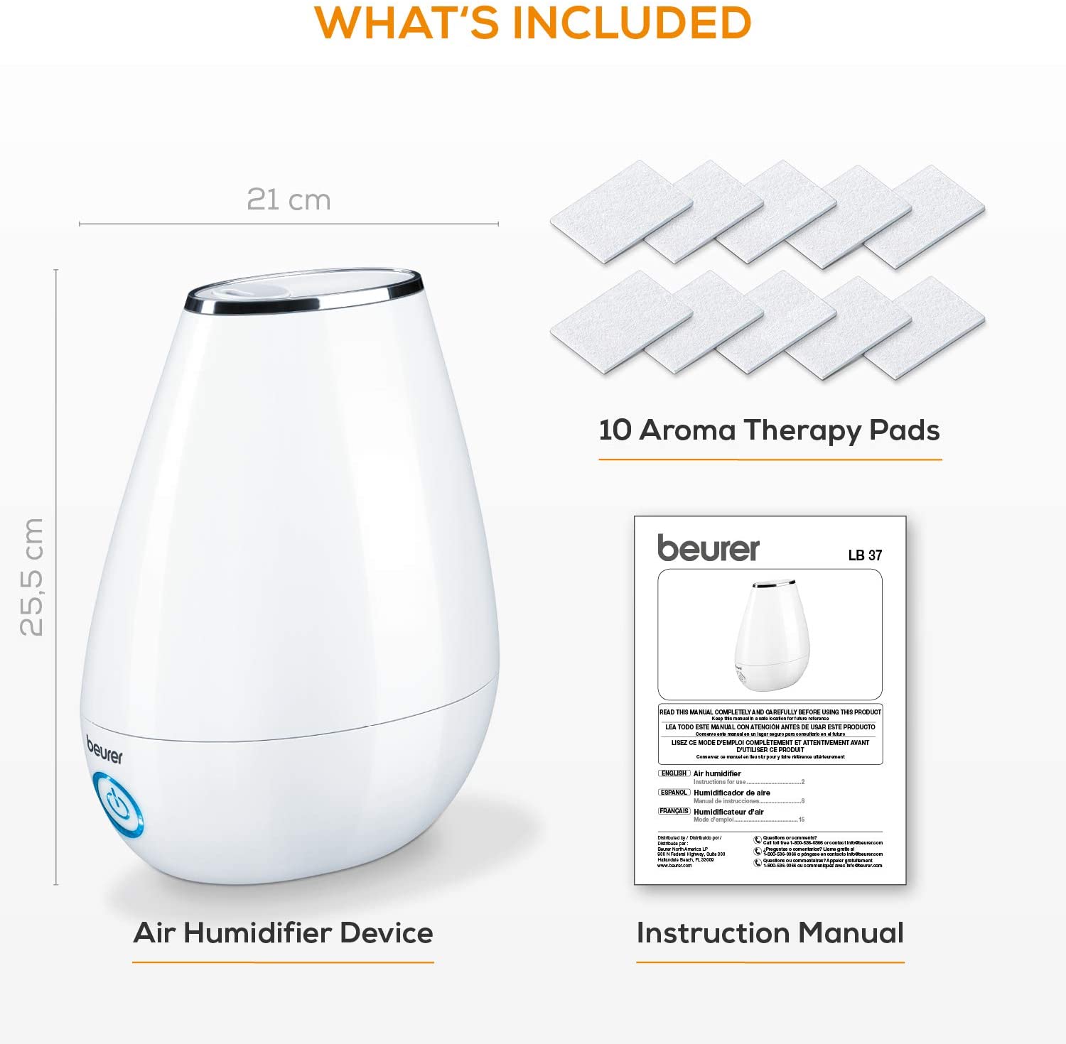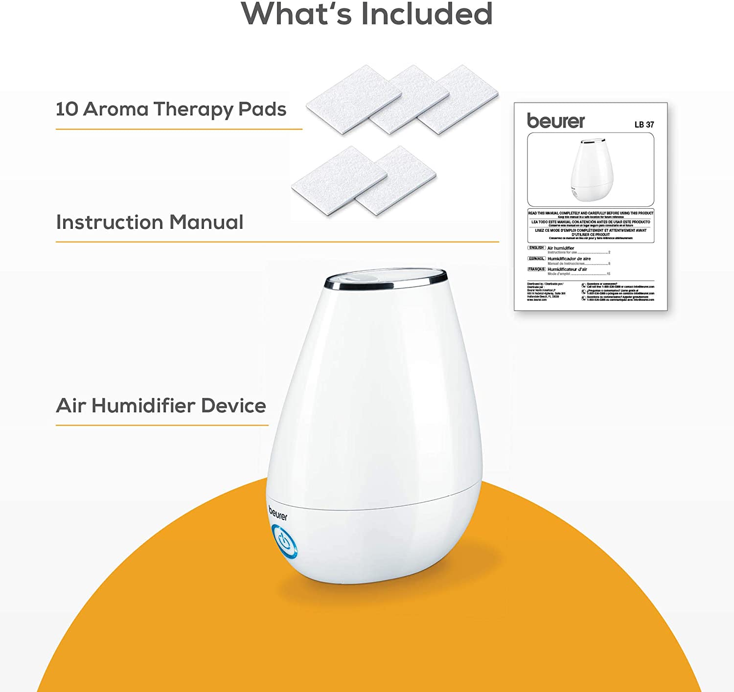 A healthy home requires healthy air. Experience what the Beurer LB37 2-in-1: Ultrasonic Humidifier & Aroma Diffuser has to offer. Healthy, moisturized air facilitates breathing, reduces dust exposure, strengthens the immune system, increases the ability to concentrate, and protects eyes and skin from drying out. With the Beurer LB37 2-in-1 Humidifier and Diffuser Unit you can have humidification and a feel-good ambiance in one device, we've made it that simple.