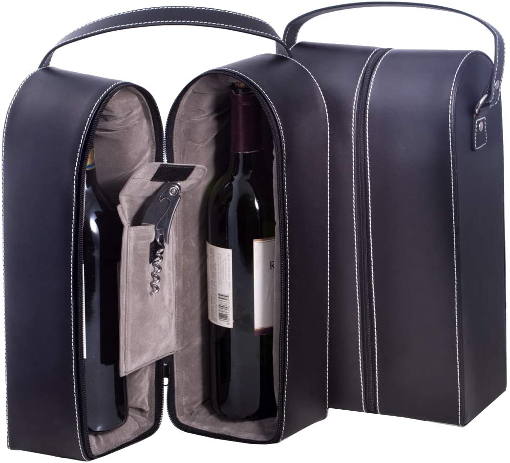 Carry up to two bottles of wine wherever you go with this wine carrying case. Made from leather, this caddy has a plush interior to provide an extra layer of protection. Coming with a wine opener, this case is the perfect addition to any picnic or whenever you need wine on the go.Materials: LeatherSet includes: Caddy and wine openerDimensions: 7.25 inches wide x 4.25 deep x 13.5 longType: Bar SetSet Include: 2 PieceColor: Black