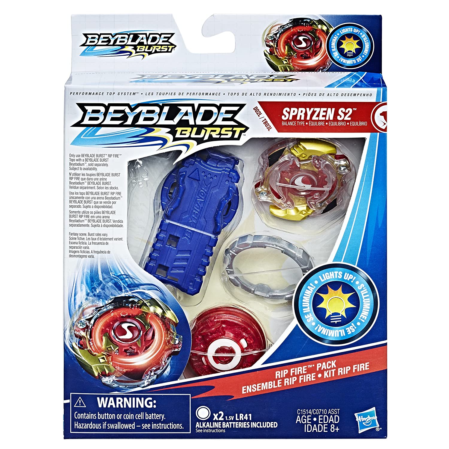 Face off against an opponent with Beyblade Burst Rip Fire tops that can "burst" into pieces resulting in 2 points for the other player (burst rates vary). First blader to reach 3 points wins. Beyblade Burst Rip Fire tops have all the burst action of Beyblade Burst tops plus a light-up feature for an eye-catching effect. Includes 1 Beyblade Burst right-spin launcher & 1 Beyblade Burst Rip Fire right-spin top consisting of Beyblade Burst: Energy Layer -- Spryzen S2 (aka Storm Spryzen) Rip Fire Forge Disc -- D02L (aka Knuckle) Rip Fire Performance Tip -- TD03L (aka Unite) Scan code on Beyblade Burst Rip Fire tops’ Energy Layers to unlock them and mix and match with other components in the Beyblade Burst app. Let it rip! Beyblade Burst Rip Fire tops are compatible only with other Beyblade Burst Rip Fire top components and Beyblade Burst Energy Layers. Requires Beyblade Burst Beystadium, sold separately. Subject to availability. Hasbro and all related terms are trademarks of Hasbro.