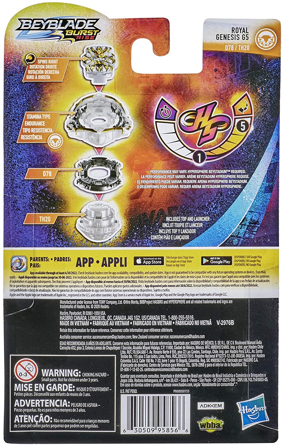 • BEYBLADE BURST COMPETITIVE BATTLING TOP: Includes right-spin Beyblade Burst Rise Hypersphere Royal Genesis G5 D78 TH20 stamina type top and Hypersphere left/right-spin launcher
