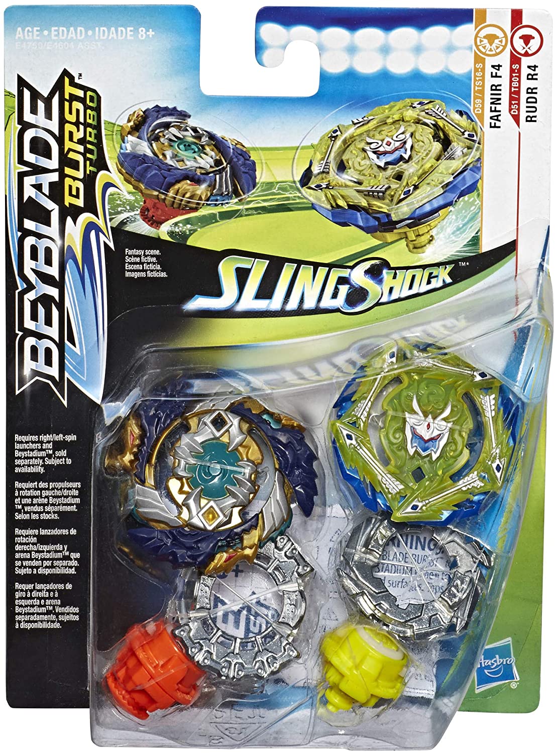 Ride the rails with Beyblade Burst Slingshock tech! Rush into battle with Slingshock tops that combine rail-riding capabilities with the ability to "burst" into pieces during battle (burst rates vary), resulting in intense head-to-head clashes. Bladers can keep the Performance Tip in Battle Ring Mode to defend their position in the Beystadium (Sold separately. Subject to availability), or convert it to Slingshock Mode to amp up the battle and ride the rails of a Beyblade Burst Slingshock Beystadium (Sold separately. Subject to availability).   Includes 2 Beyblade Burst Slingshock tops consisting of Beyblade Burst: Energy Layer -- Fafnir F4 (left-spin) Forge Disc -- D59 Performance Tip -- TS16-S Energy Layer -- Rudr R4 (right-spin) Forge Disc -- D51 Performance Tip -- TB01-S Requires 2 Beyblade Burst right/left-spin launchers and 1 Beyblade Burst Beystadium, each sold separately. Subject to availability. Hasbro and all related terms are trademarks of Hasbro.