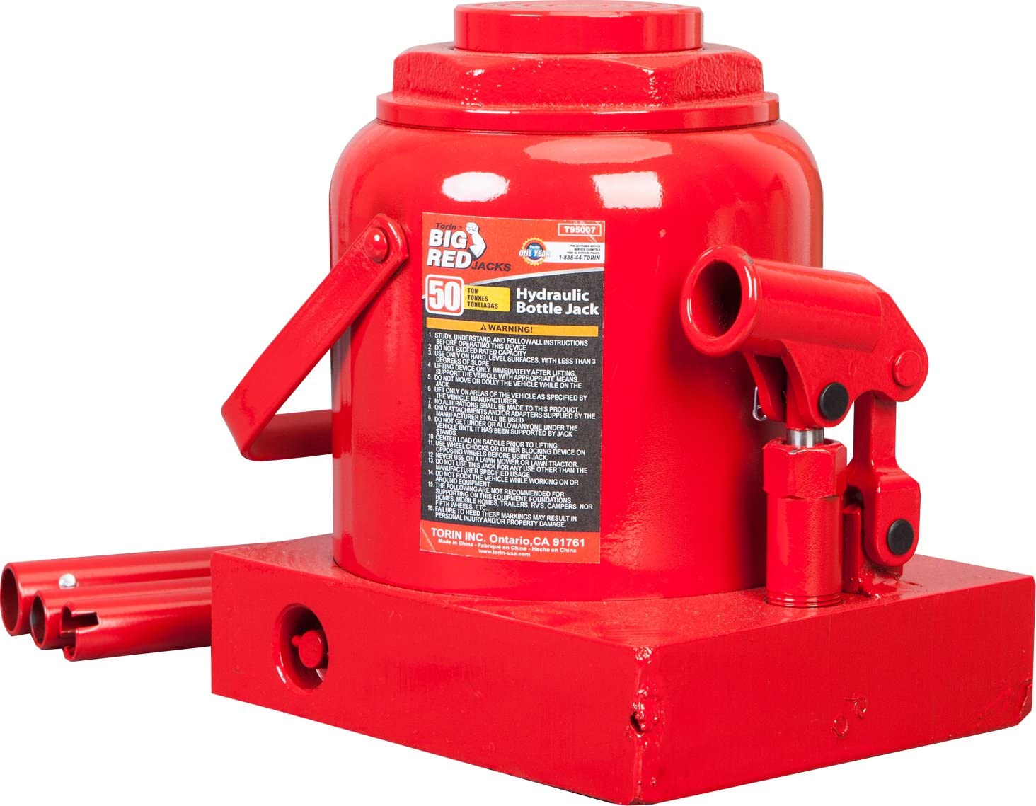 The Torin BIG RED T95007 stubby low-profile hydraulic bottle jack is designed for residential and commercial use. It is industrial welded and engineered using a drop forged alloyed steel construction that is ideal for quality and durability. The inner/outer welded structure and steel construction will keep your bottle jack leak-free and give it an overall stronger build. The fully welded structure is designed for hard-hitting commercial use, making large loads easy to lift. A wide, rugged base adds stability and strength. The lifting range is 9-5/16" to 14-1/16" with a 50 ton (100,000 lb) capacity. It features a high-quality glide-action pressure pump designed to lift with minimal muscle and effort and has an integrated built-in oil-bypass and overload valve that protects the hydraulic system from extending beyond its travel limits. Hydraulics are powered with a high-quality oil, which offers better corrosion resistance and high/low temperature flexibility, allowing the unit to operate at temperatures between 40 degrees Fahrenheit and 105 degrees Fahrenheit. Piston ram utilizes a Y-style polyurethane sealing ring with backup ring, preventing the load from falling slowly. This powerful bottle jack is ideal for lifting cars, trucks, SUVs, farm vehicles, heavy-duty machinery and industrial equipment. It can also be used for military applications, agricultural and industrial environments where the equipment receives heavier abuse. This unit is 100% factory tested for reliability and safety to meet and comply with ASME PASE safety standards. Includes a limited 1 year manufacturer warranty.