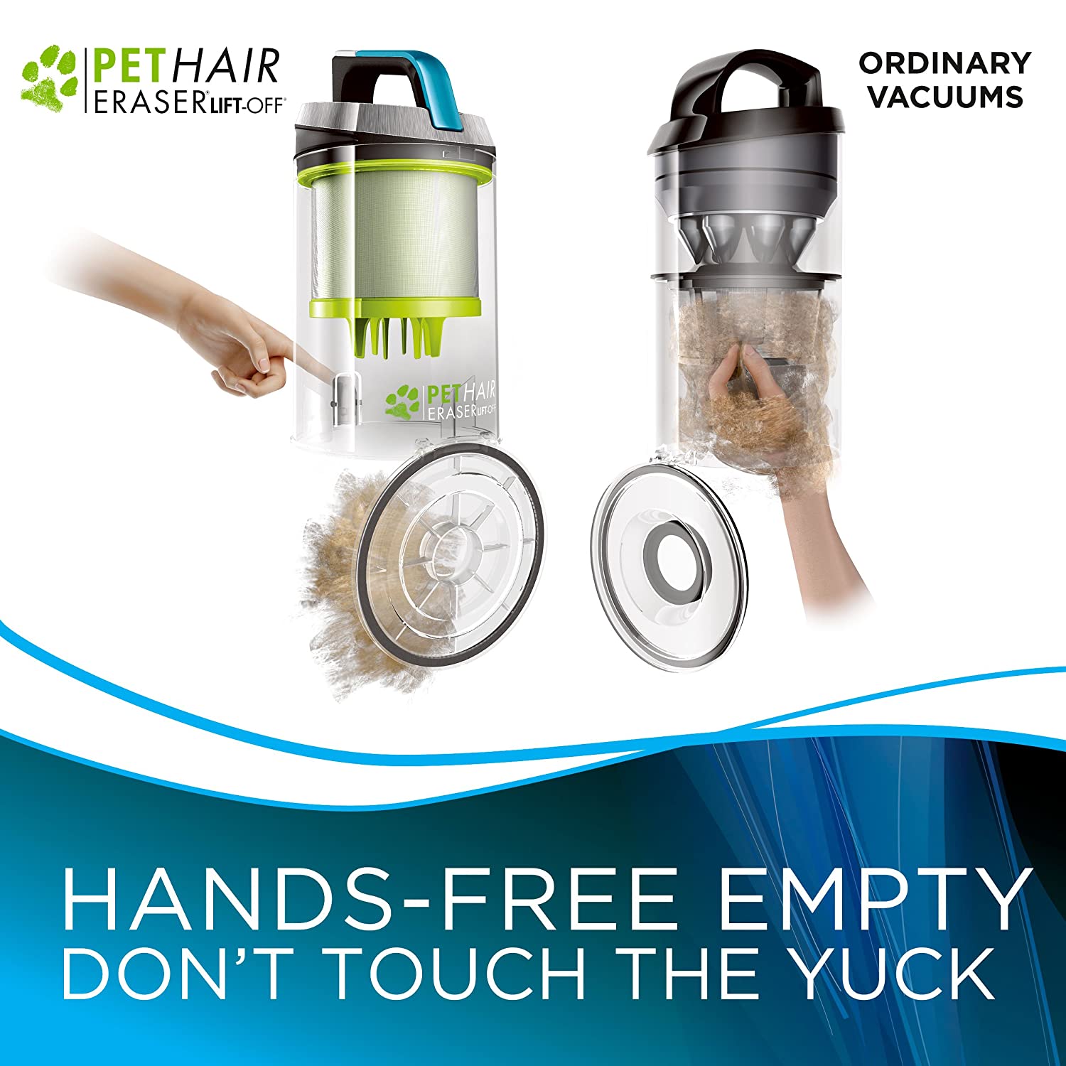 Pets are a part of our families, but having pets also means chasing after the pet hair, dirt, dander, allergens, and odors they leave behind. The cleanup is now easier than ever with the Bissell pet hair eraser Lift-Off, engineered specifically for homes with pets. This innovative 2-in-1 Lift-Off vacuum combines the power of an upright and the convenience of a detachable, portable canister to clean in places other vacuums can't. Say good-bye to hair wrap with the tangle-free brush roll, tackle pet hair on stairs, upholstery, and other hard-to-reach areas with the built-in telescoping extension wand and specialized pet tools, and help capture allergens and eliminate odors with the smartseal Allergen system with Febreze. When you're finished cleaning, enjoy a hands-free empty with the cyclonic pet hair spooling system so you don't have to touch the yuck. Spend more time with your pets and not cleaning up after them with the Bissell pet hair eraser Lift-Off. Febreze and related trademarks are owned by the Procter & Gamble company, Cincinnati, Ohio, and used under license by Bissell Homecare, Inc.