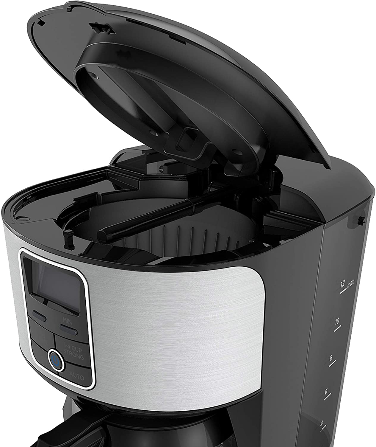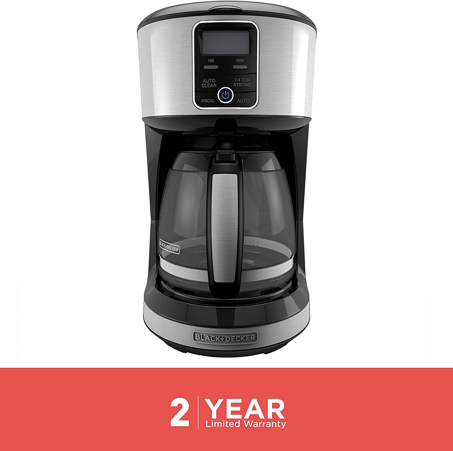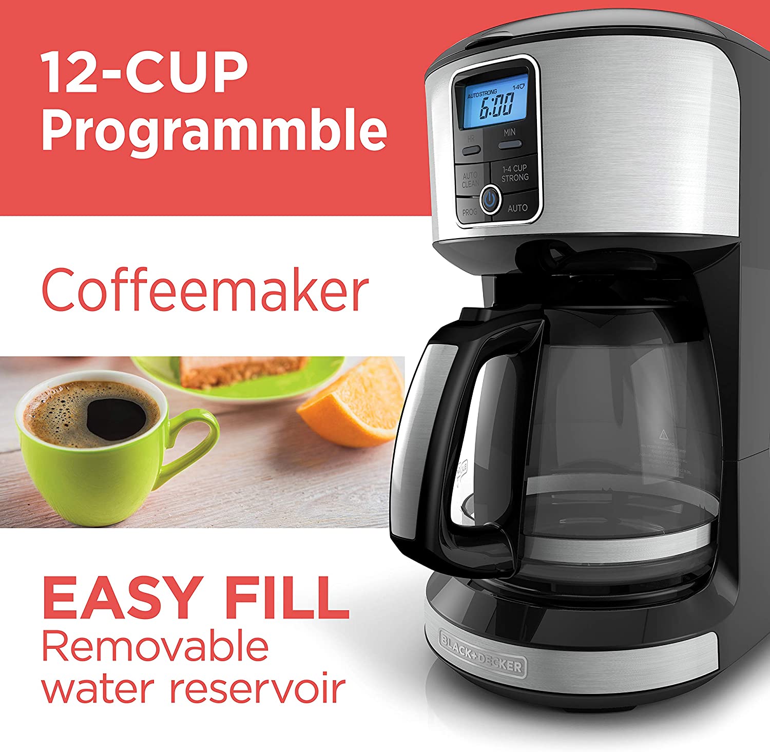The BLACK+DECKER 12-Cup* Programmable Coffee Maker is engineered to use optimal water temperatures for brewing delicious coffee in large or small quantities. Get started with the removable water reservoir, which can be filled under the faucet. It includes clear level markings so you get the perfect amount of coffee every time. Auto brewing is easy using the large programming buttons and the digital display, plus you can customize brew strength and size. Other useful features on this automatic 12-Cup* coffee maker include: Evenstream Showerhead, Sneak-A-Cup, Perfect Pour glass carafe, option for one- to four-cup brews, and washable brew basket.