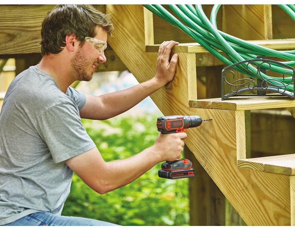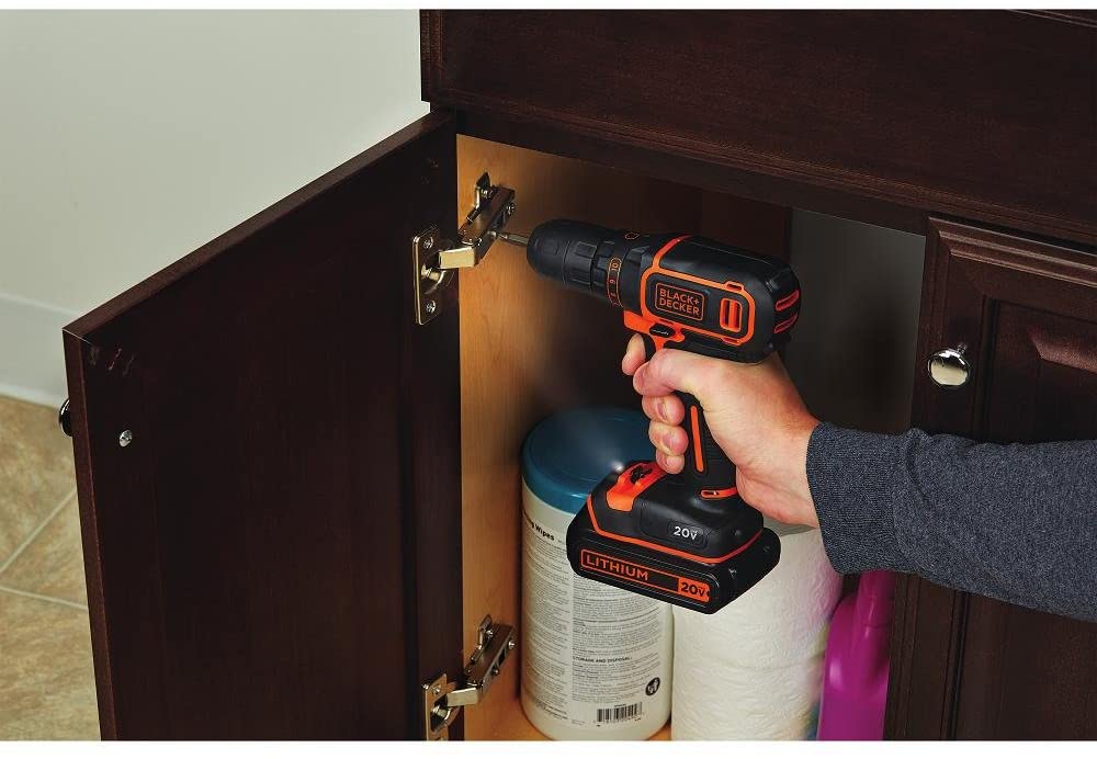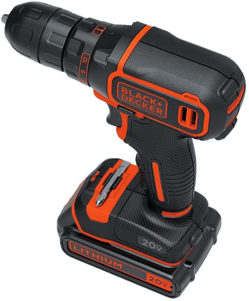 The BLACK+DECKER BDCDD120C 20V MAX* Lithium Single Speed Drill/Driver allows you to hang pictures, shelves and more in a snap with this compact, do-it-all drill/driver. Small and light than most, it fits in tight spaces (with an LED to light your way) while still delivering the power needed to complete most household tasks. The compact design, 35% smaller than the GC1801 Drill/Driver, allows you to fit in tighter spaces (behind appliances, inside cabinets, inside closets, etc.). This tool is lightweight at 2.5 lbs and provides less fatigue and makes it easy to move from room to room. The keyless chuck allows for easy bit changes. An 11-position clutch helps prevent stripping screws or damaging material and an LED light illuminates the project surface. The mid-handle design helps make the drill comfortable to use. Part of the 20V MAX* System - 1 System. Endless Tasks. Power for your Style. Includes: (1) 20V MAX* Battery, (1) Battery Charger, (1) Double Ended Bit.