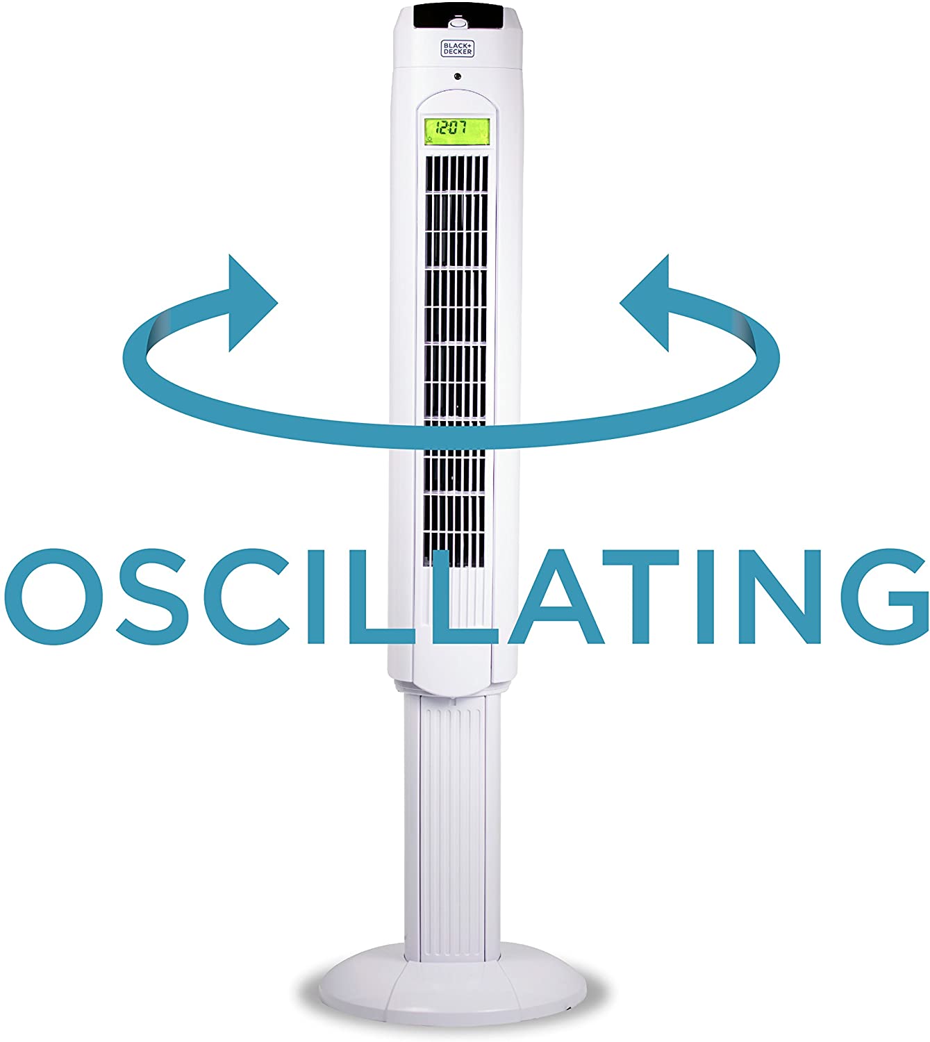 This BLACK+DECKER tower fan is the perfect addition just about anywhere in the house where increased air flow is a necessity. You have three speeds to control just how much air you want to push in a direction or use the oscillation function to expand the scope of the circulation area. With the timer, you don't even need to be around to start and stop your unit. Operating from the controls and digital display of the unit itself or the "couch potato" remote control, you'll have that much needed relief in seconds. Included Components: Tower Fan, Remote