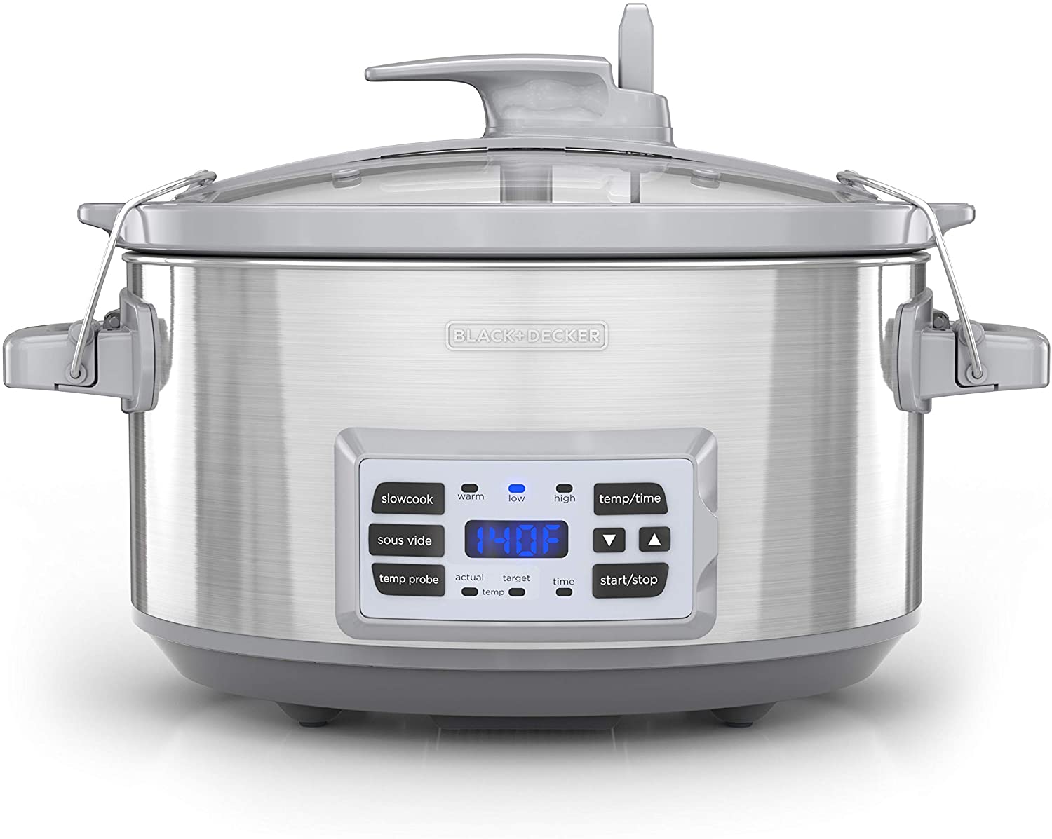 The BLACK+DECKER 7-Quart Digital Slow Cooker with Temperature Probe + Precision Sous-Vide gives you three ways to cook 1 ) Classic slow cooking is simple in the 7-quart stoneware crock Just add in the ingredients and let the low constant heat go to work on roasts soups chilis and so much more! 2 ) Use the temperature probe to achieve ideal results on a variety of proteins Just set the desired temperature insert the probe into the meat and the slow cooker will do the rest 3 ) For restaurant-quality results without the hassle or guesswork use the Sous-Vide Function Just arrange single servings of food inside the resealable bags set the time and temperature based on what you’re cooking and the level of doneness you prefer and then insert the temperature probe into the water The sous-vide method helps prevent overcooking by heating the water that surrounds the food bringing it to the desired internal temperature When slow cooking three heat settings give you options to find the best temperature for your schedule—Low for 8-9 hours of cooking High for 3-4 hours and Warm for keeping food at the ideal serving temperature Plus cleanup is easy thanks to the dishwasher-safe stoneware pot and tempered glass lid
