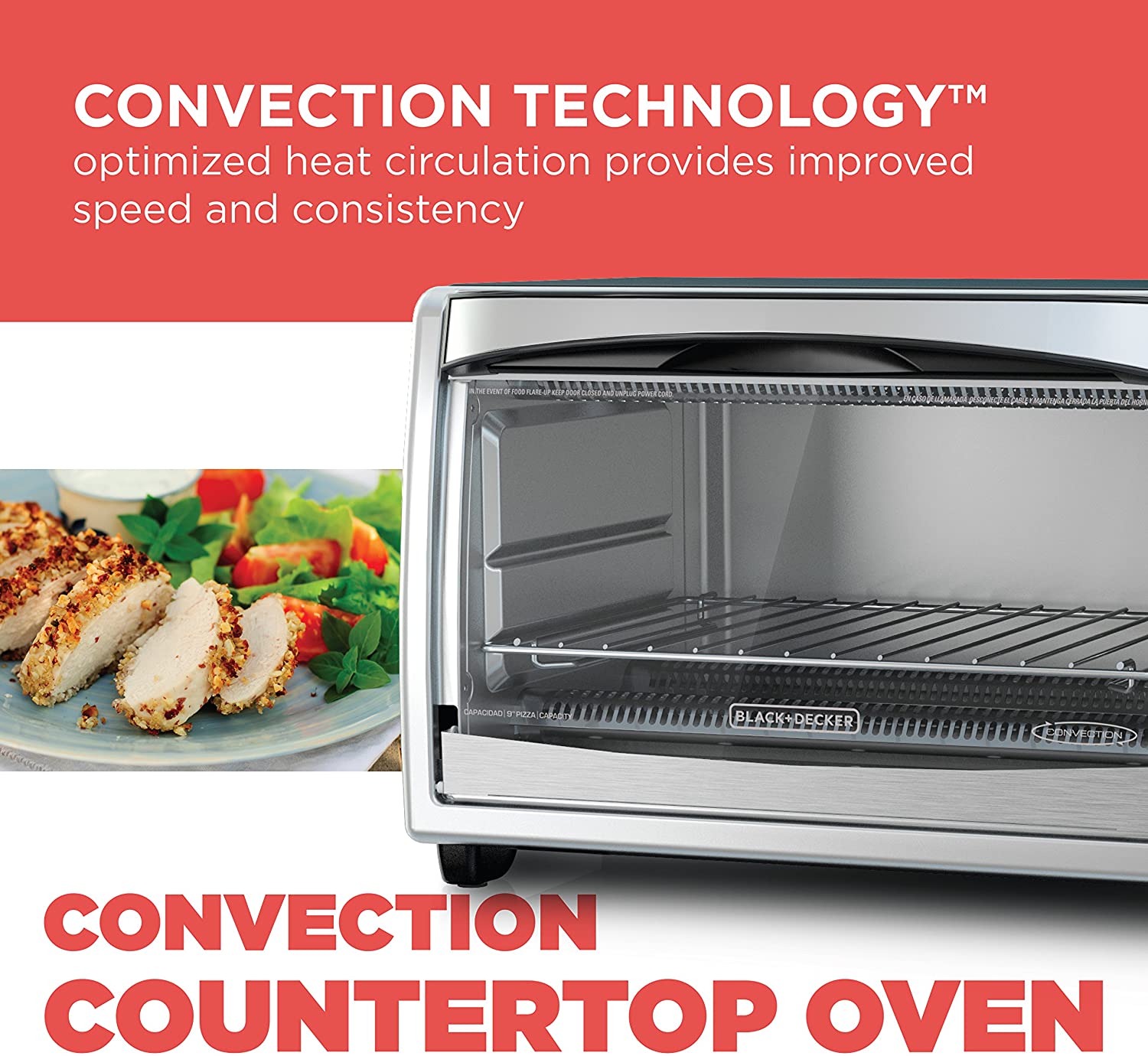 Countertop cooking made easy. The BLACK+DECKER 6-Slice Stainless Steel Convection Toaster Oven with Broiler Pan is great for baking 9” pizzas, making toast for the whole family, and reheating leftovers into hot, crispy deliciousness. This versatile toaster oven bakes, broils, toasts, and keeps food warm, at up to 450°F. The 60-minute precision timer ensures ideal results for all of them. Plus, this convection toaster oven comes with a baking and broiler pan that fits perfectly. When it’s time to eat, trust the #1 brand in toaster ovens*—BLACK+DECKER. Large viewing window keep an eye on food during cooking. The durable glass window gives you a clear view of food throughout the cooking process. Dual position rack high and low rack slots let you position food right under the broiler, or accommodate larger portions of food.