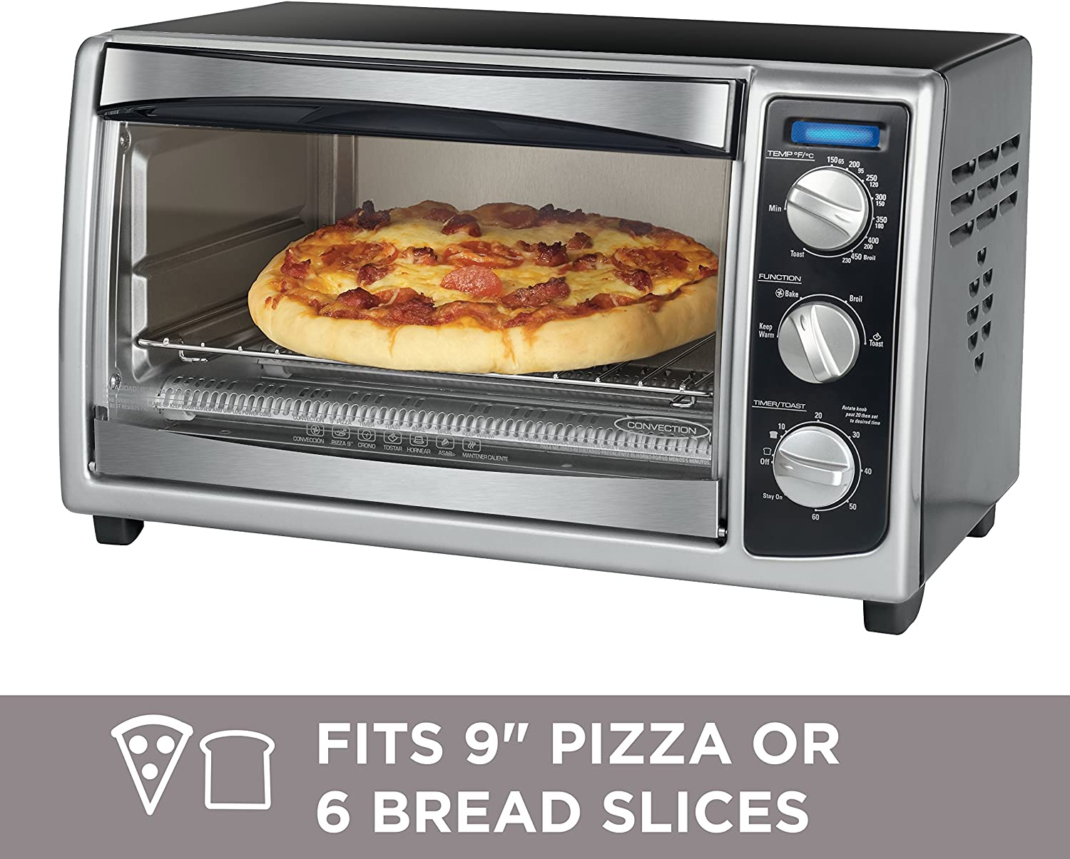 - 9” Pizza, 6 Slices of Bread - The compact toaster oven fits nicely on the countertop, while the curved interior makes room for 9” pizzas and 6 slices of bread.