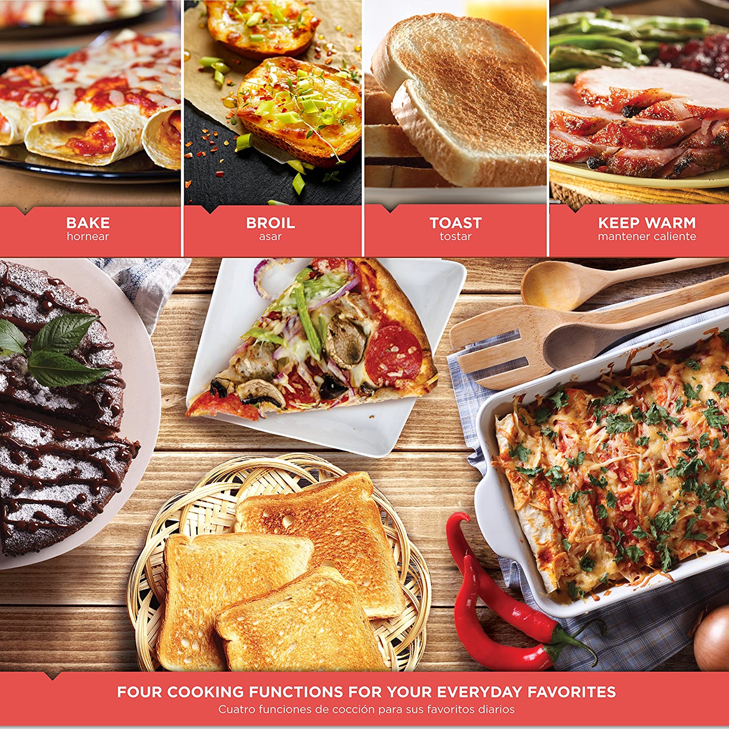 - Four Functions - The stainless steel toaster oven’s cooking functions include: baking, broiling, toasting, and keeping food warm.