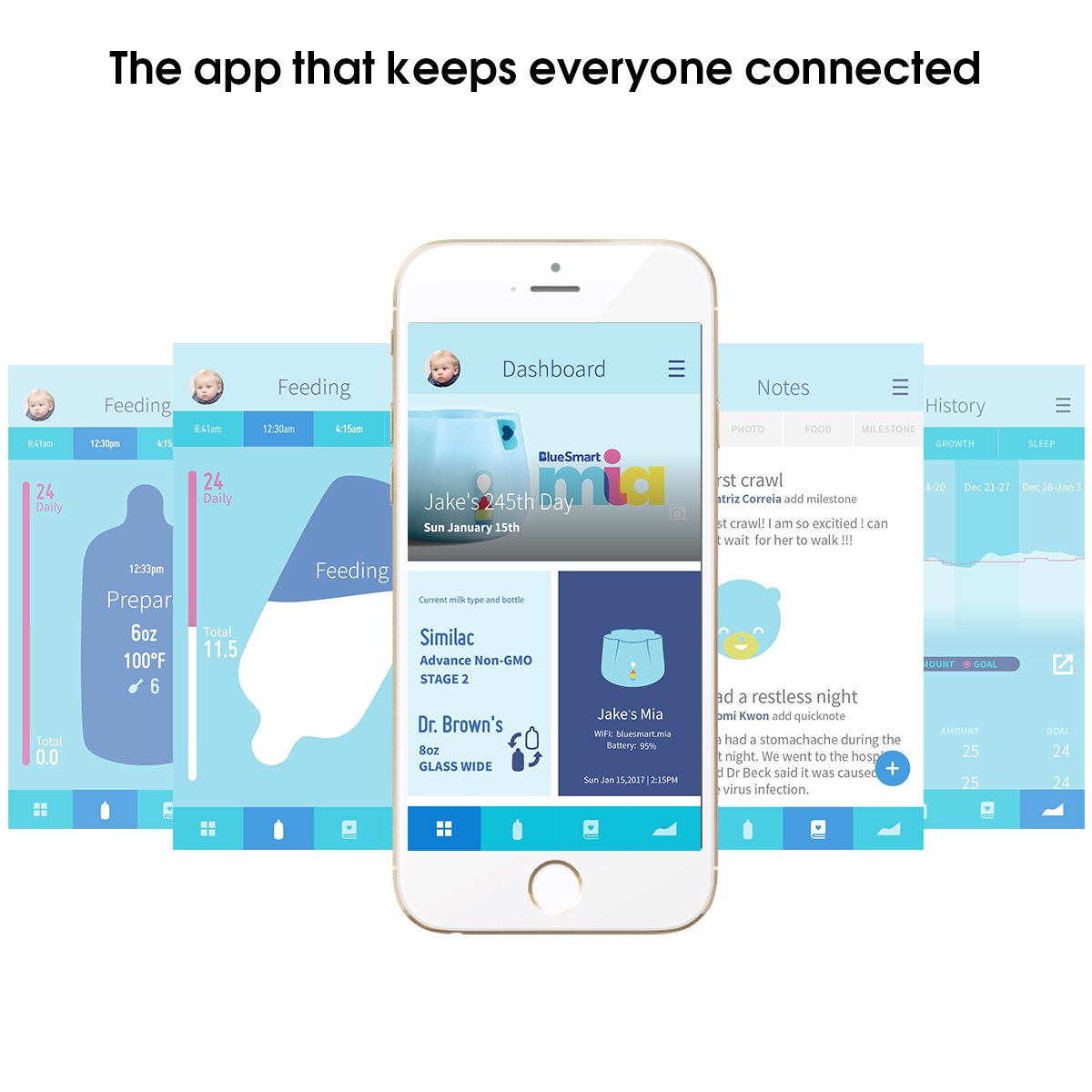 BlueSmart mia is a smart bottle feeding system that tracks and analyzes your baby's intake and consumption patterns. A silicone smart sleeve that fits most bottles, BlueSmart mia alleviates anxieties surrounding baby feeding by tracking the amount of milk consumed by your little one and alerting parents and caregivers in real-time via an easy-to-use app. BlueSmart mia connects to Wi-Fi and allows multiple users to input feeding data on their smartphone via the app – so parents can track baby’s progress anytime, anywhere.