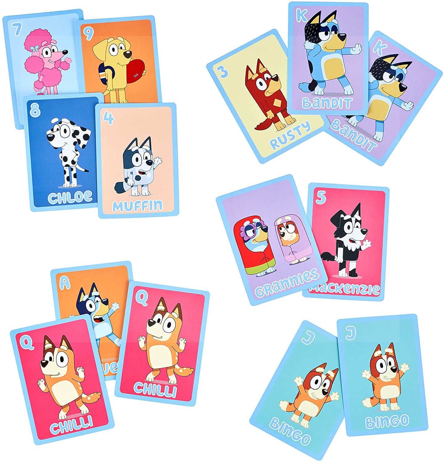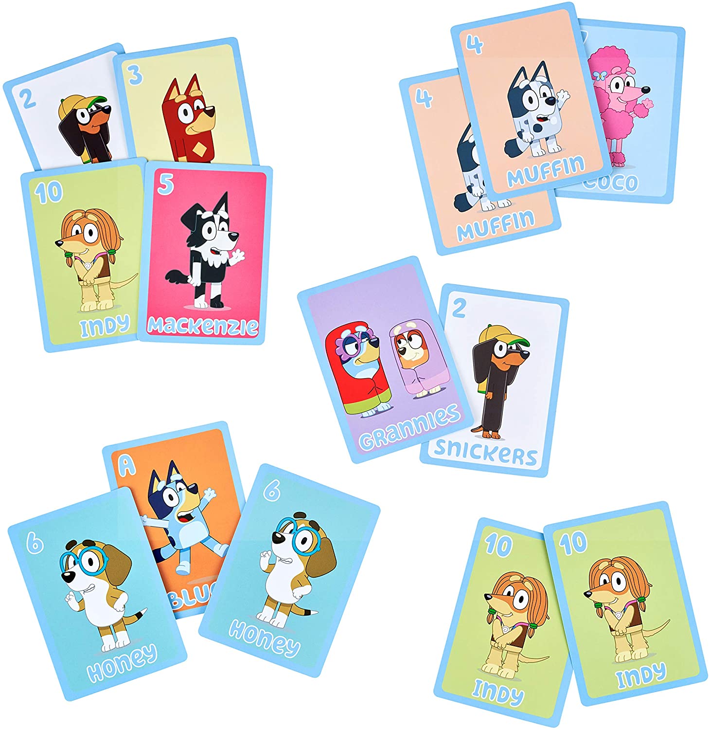 • 5 in 1 Bluey games Pack includes:Cheese 'N" Crackers (SNAP)Bluey's Battle (BATTLE)Go Fruit Bat (GO FISH)Grannies (OLD MAID)Memory