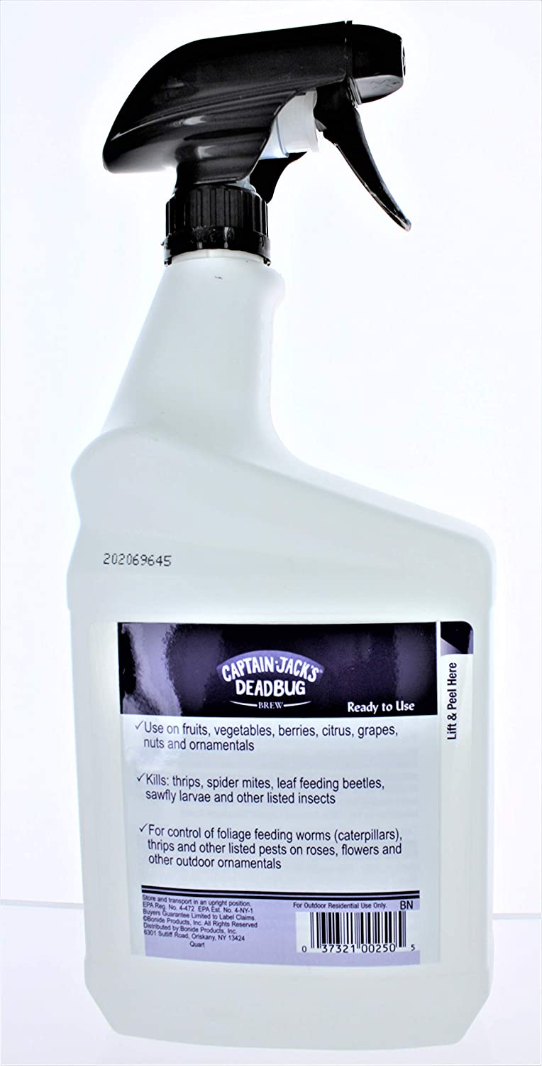 Bonide?s Captain Jack?s Dead Bug Brew kills bagworms, borers, beetles, caterpillars, codling moth, gypsy moth, loopers, leaf miners, spider mites, tent caterpillars, thrip and more. Designed for outdoor residential use in home gardens, lawns, and ornamentals. Contains Spinosad, which is a leading pesticide used worldwide in the production of organic produce. Arrives in a ready-to-use container with a spray nozzle.