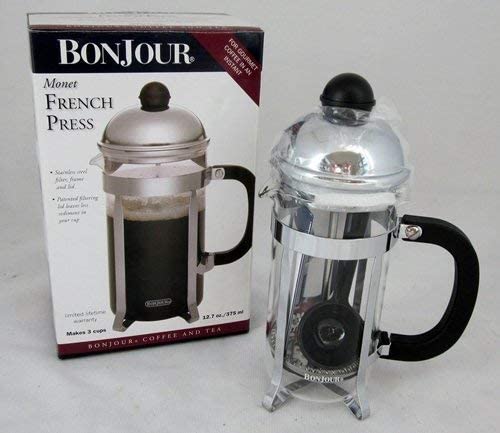 Savor authentic espresso-based and gourmet coffee drinks created with the classically styled BonJour(r) Coffee 3 Cup Monet French Press. Perfect for serving coffee for one to three, this French press is crafted from heat-resistant borosilicate glass and boasts a polished stainless steel frame and gleaming stainless steel high-dome lid. The stylish press brews 12.7 ounces - three 4-ounce espresso-sized cups - of coffee. The French press features a sturdy, comfortable handle and an easy-pour spout. A convenient filtering lid feature helps reduce sediment in cups of coffee and espresso drinks such as mochas and cappuccinos. Though top-rack dishwasher safe, handwashing the carafe is recommended to preserve its finish. This glass French press is an ideal partner for BonJour(r) Monet milk frothers and coffee items. Enjoy flavorful coffee and espresso-based masterpieces the way they were meant to taste, using the stylish BonJour Coffee 3-Cup Monet French Press.