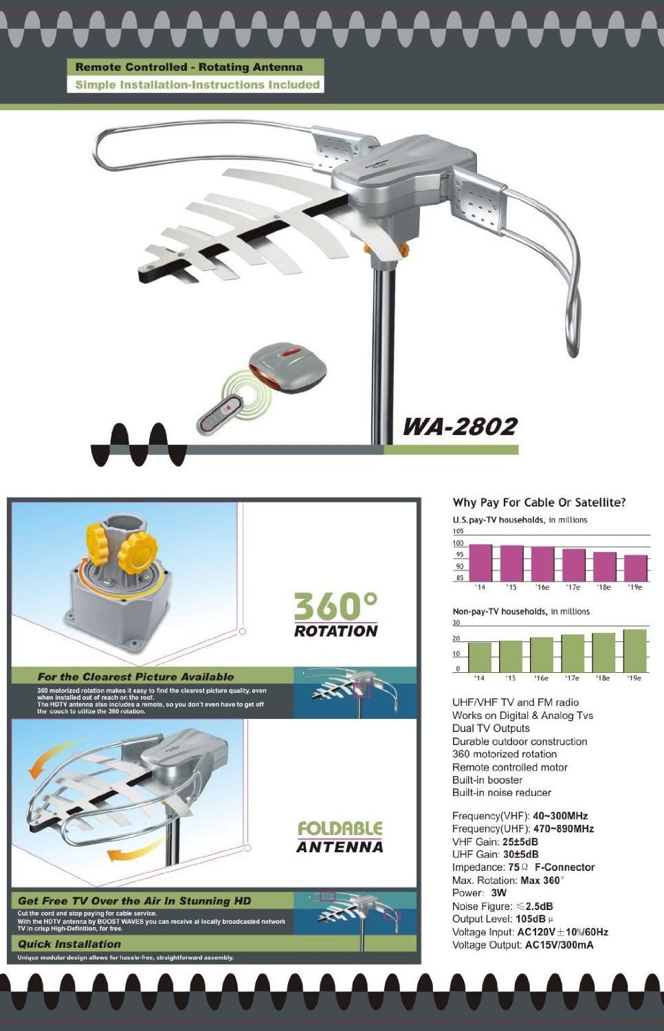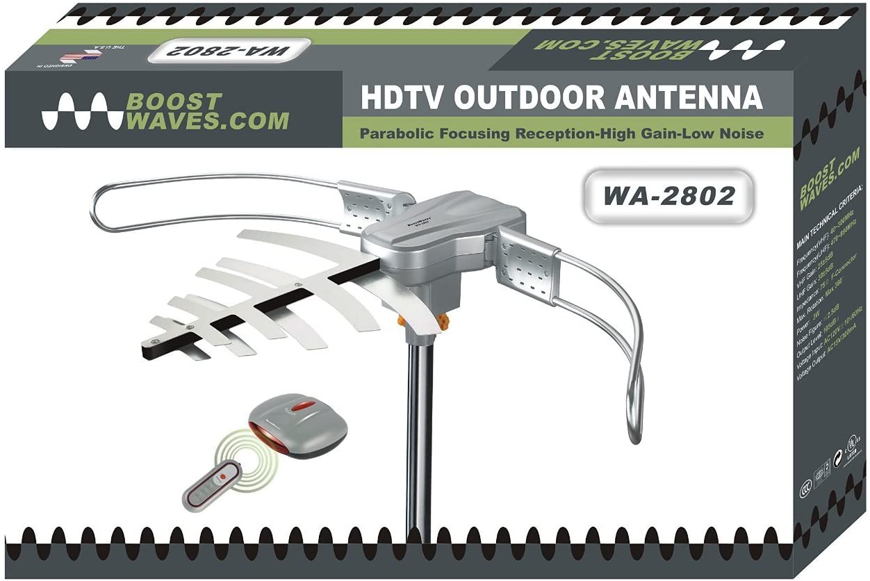 With over 1,000 stations in more than 200 markets broadcasting digital television, nine out of ten households can now receive free HDTV signals with the right antenna, a set-top box and a high-definition television. This BoostWaves Outdoor Antenna Remote Control HDTV Antenna features 360-Degree rotation to make sure you get the best HDTV reception possible. Its high sensitivity reception helps you get the weakest HDTV signals in more rural areas. These antennas are capable of receiving weaker HDTV signals when no significant multipath (ghost) conditions exist, i.e. no reflective structures nearby. INSTALLATION KIT INCLUDES 50FT ACTUAL RG6 PREMIUM LOW LOSS COAXIAL CABLE, 25 CABLE CLIPS, 20 CABLE SAFETY TIES. SPECIFICATION: FREQUENCY RANGE 47-860 MHz Gain 20-28db Reception Range: up to 125 miles Frequency: (VHF)40-260MHz Frequency: (UHF)470-860MHz VHF Gain: 253dB UHF Gain: 303dB Impedance: 75 ohm Max.Rotation: 360 Degree Rotating Speed: 4-6 rounds/min Power: 3W Working Voltage: AC 110V /60HZ Reception Range: 125 miles Package includes: 1-Antenna Main Unit 1- Redirector 1- Power Box 1- Remote Control 4-Screws 1x 50ft Coaxial Cable 1x Instruction