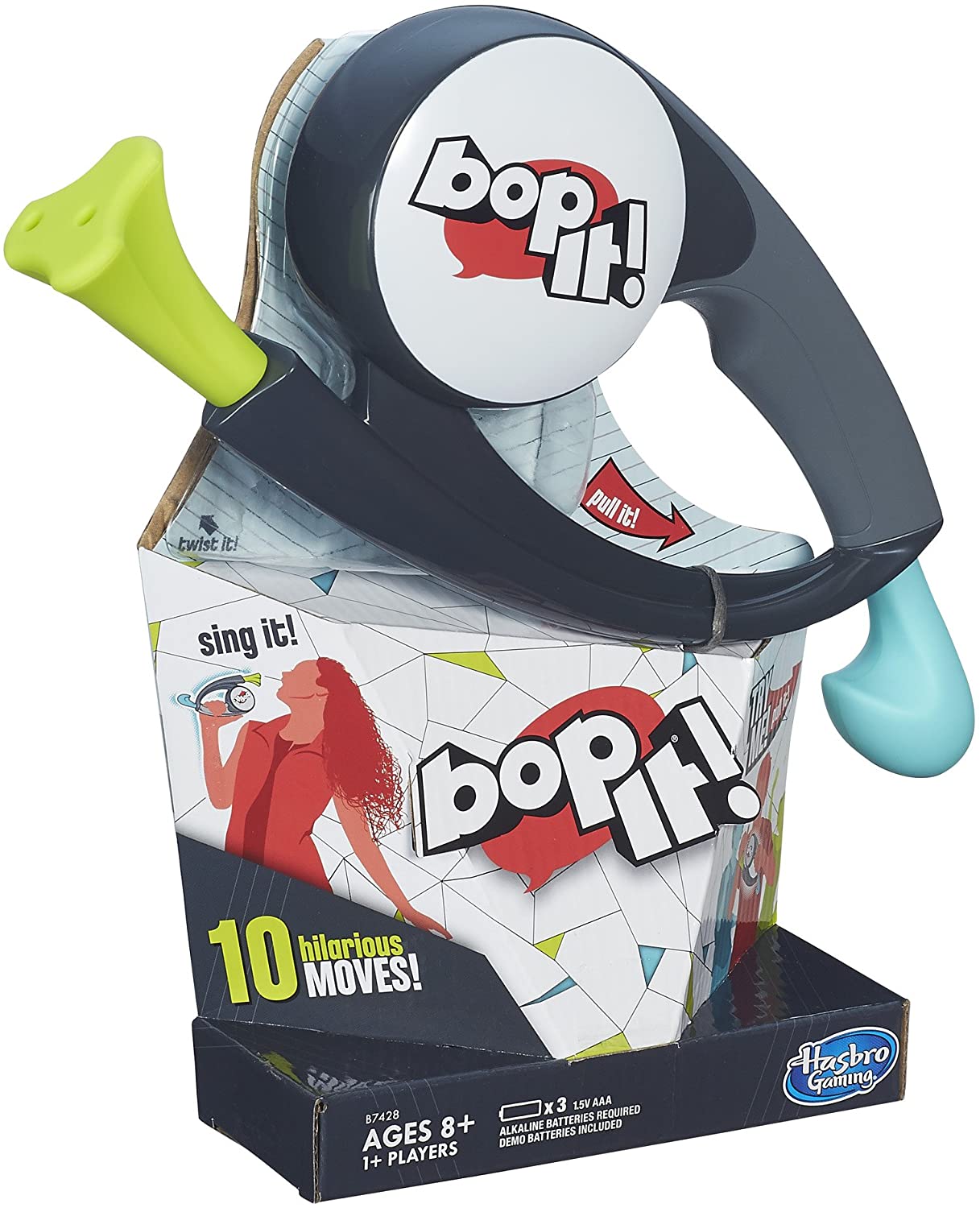 Twist it! Bop it! Answer it? Selfie it? Hammer it? This updated Bop It! game is enhanced with new action-oriented Bop It! moves for today's modern gamer. Bop It! game uses move it motion technology to test players and see if they've got the skills to master Bop It! game. The ten moves are: whip it, drink it, selfie it, hammer it, answer it, cradle it, saw it, sing it, golf it, and comb it. The Bop It! game is a portable game for on-the-go fun. It features 3 solo and social play options: Classic, Beat Box, and Pass It. For one of more players.