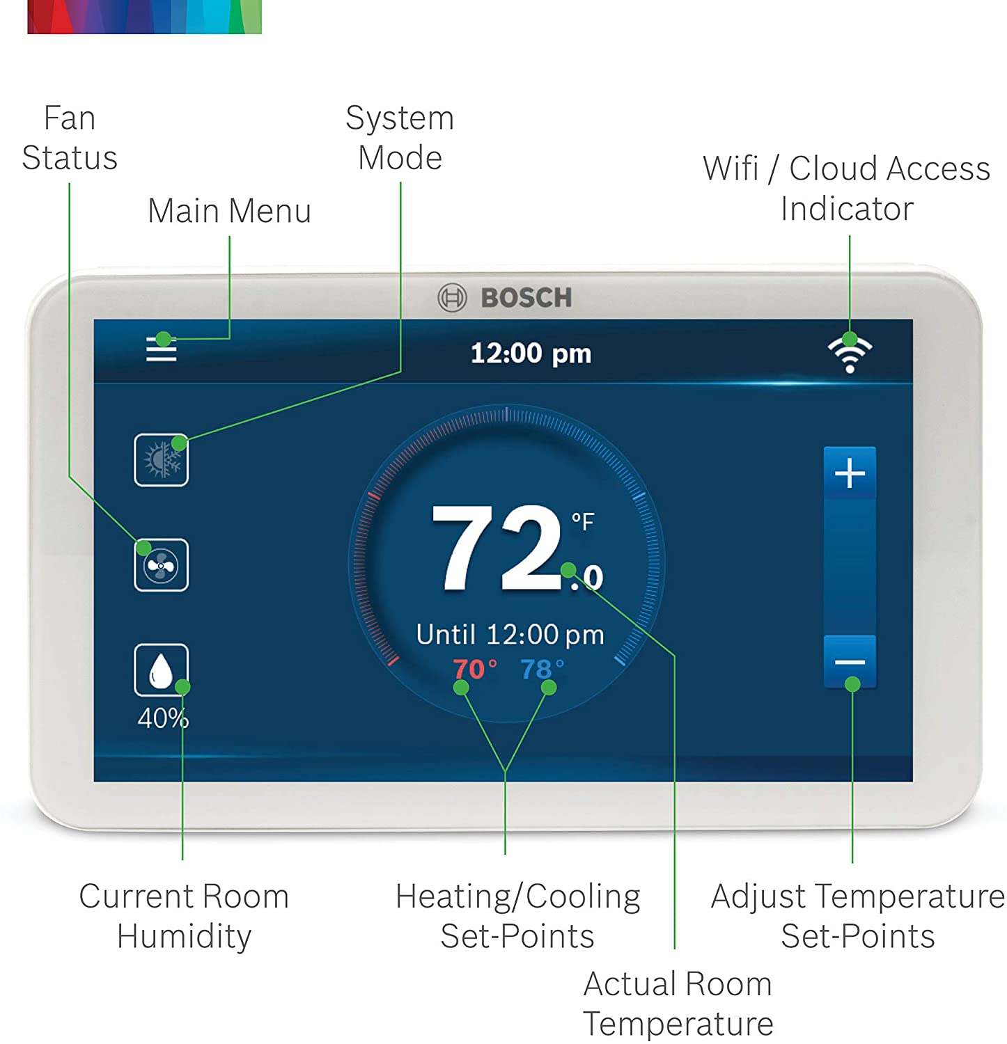 Help save energy and money with the Bosch Alexa and Google Home Connected Control Wi-Fi Thermostat. Easily control your home temperature with the sound of your voice as you communicate with the Alexa smart device. The full color 5-inch display thermostat touchscreen automatically turns on and off while you're away from home. Both comfort setting and intuitive scheduling makes it easy for you to choose a temperature for different times of the day without having to worry about your house being to hot or cool while not being there. Easily connect to Wi-Fi and view outside temperature to determine your in-home temperature throughout the day. The touch screen main menu features, date, time, temperature control, humidity, fan operations and general mode. You are able to access the main screen and set up thermostat from any smart phone or tablet. The Bosch Thermostat is compatible with any 24 VAC HVAC equipment on the market or any humidifier or dehumidifier. A C-wire (common wire) is required to power the unit. The C-wire is used to provide power to the thermostat and is available on most HVAC systems today that have three or more wires. Third party aftermarket products exist for adding powering options in instances where a C-wire does not exist. Includes a 5-year manufacturer . Product Enhancements for Commercial Use: Humidifier Algorithm Update allows the thermostat to control both evaporative and steam type external humidifier accessories. Dehumidifier Algorithm update includes Hot Gas Reheat compatibility that allows the thermostat to meet the humidity set point when connected to products equipped with a Hot Gas Reheat coil, such as a Bosch Water Source Heat Pump. This feature also allows the thermostat to meet the humidity set point through passive dehumidification when using Bosch Water Source Heat Pumps equipped with an ECM Motor. The new Cool to Dehumidify feature allows the thermostat to meet the humidity set point while in cooling operation when connected to an external dehumidifier accessory. Both configurations allow the thermostat to function as a humidistat to meet the humidity set point.