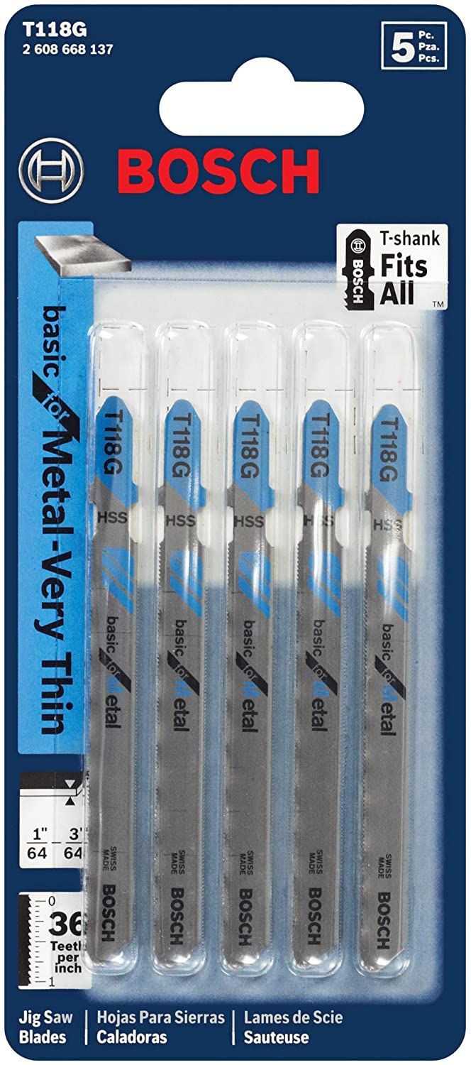 Jig Saw Blade, Material HSS, Primary Saw Application Metal, Shank Type T, Teeth per Inch 36, Length 3-5/8 In., Application Very Thin 1/64 to 3/64 In. Ferrous and Nonferrous Metals, Package Quantity 5 BOSCH is the world-wide market leader for jig saw blades. This means uncompromising quality, innovative ideas and universal use. Whether for miter, straight or curved cuts, BOSCH sells the right saw blade designed for high performance in all major brand jig saws.